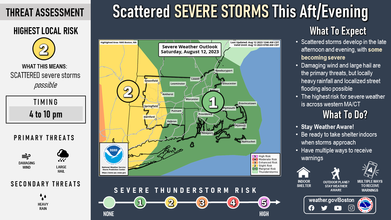 Good morning, There is not much change to the forecast regarding the severe weather potential today. Scattered storms are expected to develop later this afternoon and evening, and some storms may become severe. The primary threat is damaging wind and large hail, but locally heavy rainfall leading to street flooding is also possible. While severe storms are possible across all of SNE, the highest risk is across western MA/CT. Another round of a few strong to possibly severe storms are expected Sunday, with the greatest risk across eastern MA and Rhode Island. Please keep in touch with the latest forecasts and possible watches and warnings later this afternoon and tonight. Thank you. Kevin Cadima and Rob Megnia If you have any questions or would like more information, please don't hesitate to contact us. You can reach us via: email: box.operations@noaa.gov phone: 508.622.3280 Slack/NWSChat 2.0 <https://nwschatws.slack.com/> (for approved partners) social media: Website <http://www.weather.gov/boston> | Facebook <http://www.facebook.com/NWSBoston> | Twitter <http://www.twitter.com/NWSBoston>