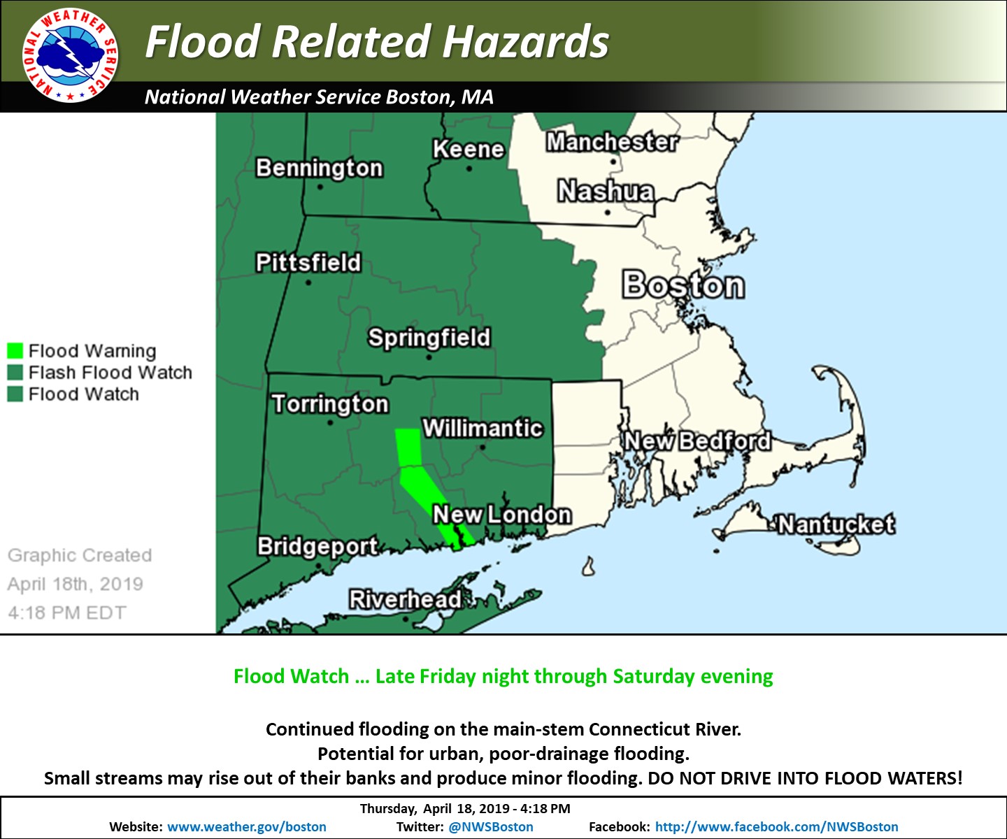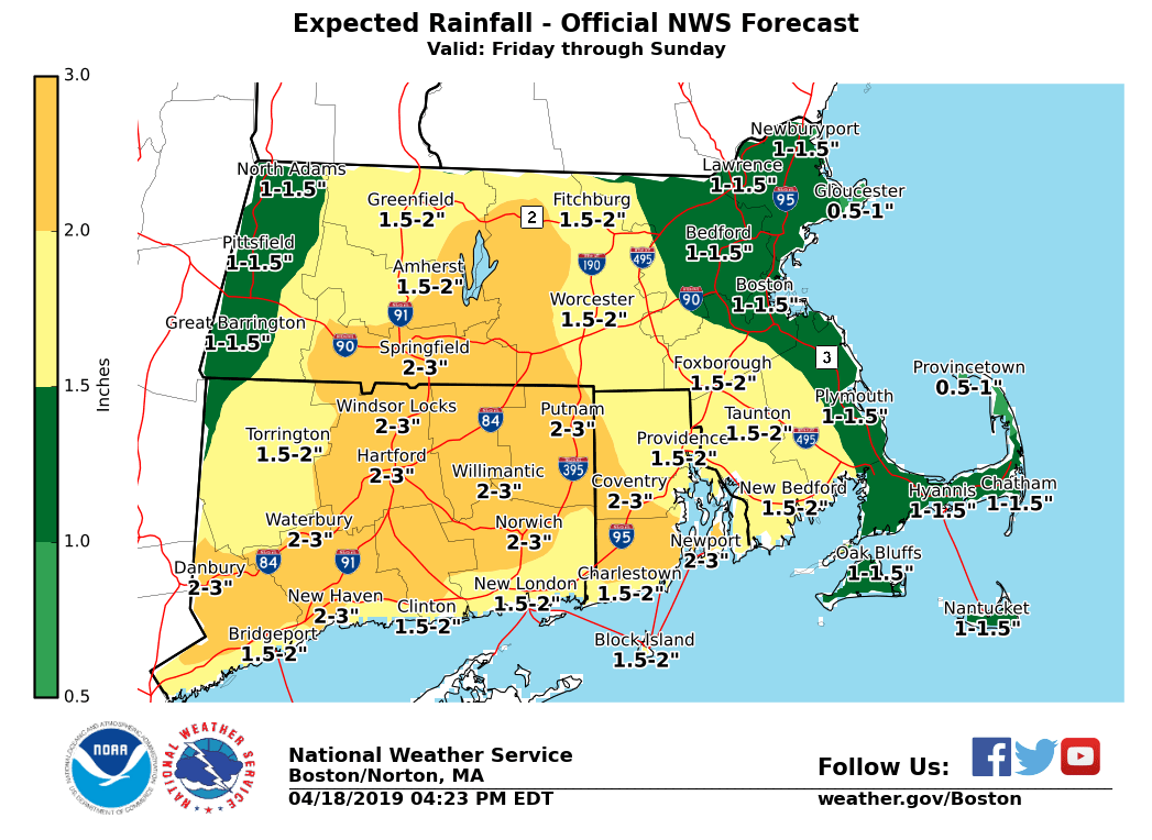 Good afternoon, We are monitoring a storm over the Midwest that will draw unseasonably humid air over Southern New England. - A Flood Watch has been issued for Western and Central Massachusetts and Northern Connecticut. - Storm Total Rainfall of one to two inches is forecast. Locally heavier amounts are possible. *(see attached graphic)* - Expect rain from the weather system to reach our area late Friday and Friday night, then continue through Sunday. (Sprinkles/drizzle are possible tonight and Friday.) - Heaviest rain in Western/Central Mass and Northern Connecticut will be Friday night and Saturday. If you have any questions or would like more information, don't hesitate to contact us via this email address, on NWSChat <https://nwschat.weather.gov/>, or at the following: National Weather Service Boston/Norton, MA 46 Commerce Way Norton, MA 02766 508.622.3280 Website <http://www.weather.gov/boston> | Facebook <http://www.facebook.com/NWSBoston> | Twitter <http://www.twitter.com/NWSBoston>