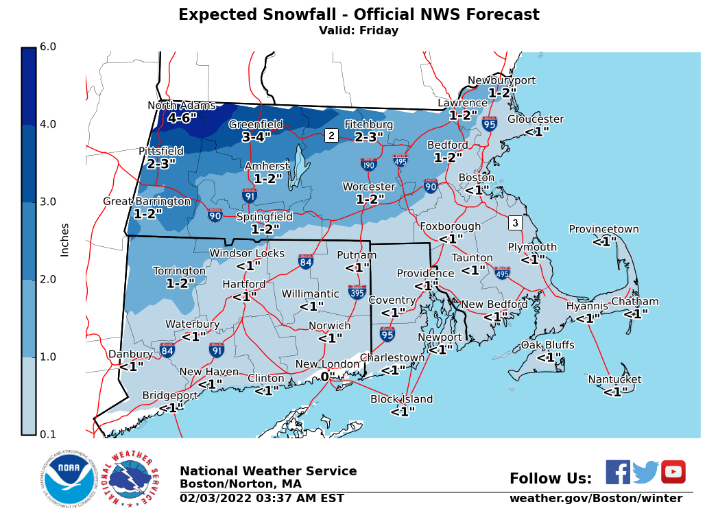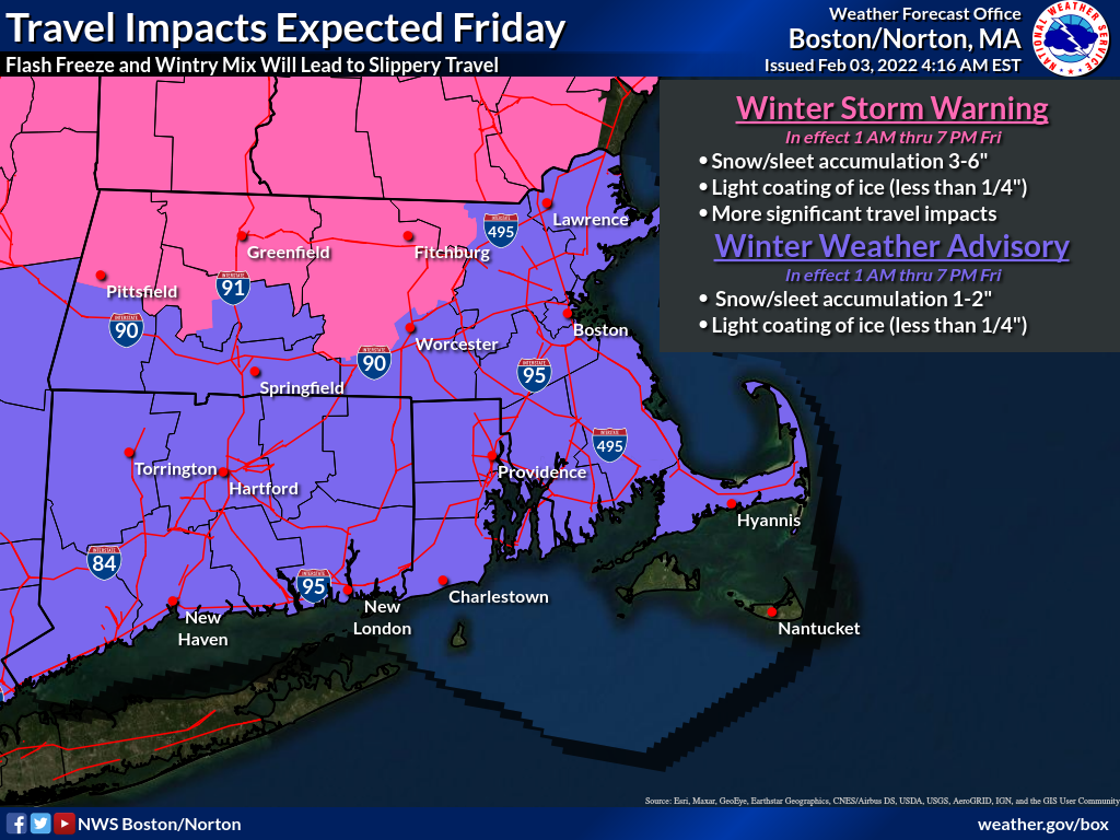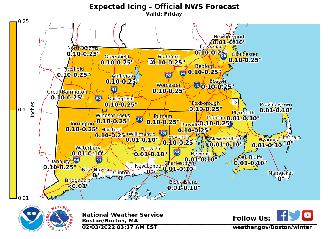 Good Morning Everyone, Attached is the updated briefing and related images for the wintry mix on Friday. *Winter Weather Headlines:* - Winter Storm Warning from northern Berkshire County into north central Massachusetts, where we expect the greatest travel impacts on Friday. - Winter Weather Advisory for the rest of southern New England except for Block Island, Martha's Vineyard, and Nantucket, where at least minor travel impacts are expected on Friday. The Islands may be included in the Advisory in later forecast updates if the potential for a wintry mix increases. *What Has Changed:* - Increased snow/sleet totals slightly from the previous forecast north of Route 2 in Massachusetts. - More confident in changeover timing on Friday - Still some uncertainty in the duration of sleet and freezing rain. It still appears that any icing from freezing rain will be less than 1/4 inch. If sleet is more dominant, then there could be sleet accumulations of 2 or 3 inches. Thanks, Joe Dellicarpini and Kevin Cadima If you have any questions or would like more information, don't hesitate to contact us via this email address, on NWSChat <https://nwschat.weather.gov/>, or at the following: National Weather Service Boston/Norton, MA 46 Commerce Way Norton, MA 02766 508.622.3280 Website <http://www.weather.gov/boston> | Facebook <http://www.facebook.com/NWSBoston> | Twitter <http://www.twitter.com/NWSBoston>