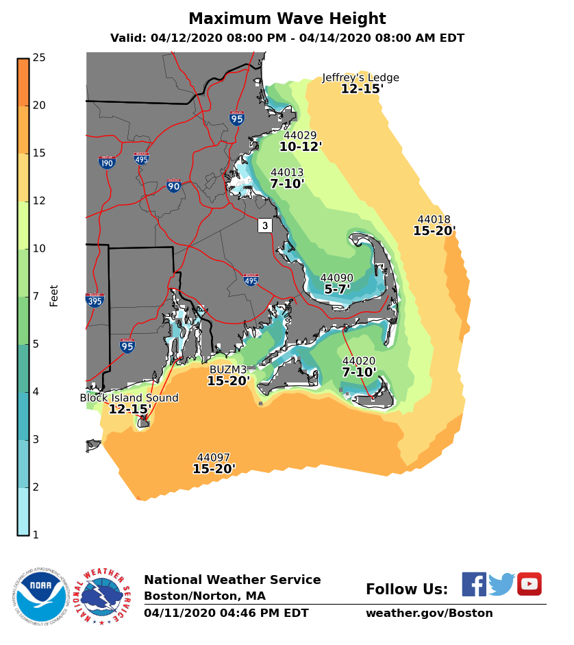 Good afternoon, Confidence has increased this afternoon in the potential for damaging wind gusts and power outages on Monday. Greatest time of concern is late Monday morning into early Monday evening. Attached are graphics of the watches that have been issued, the maximum wind gusts and maximum wave heights expected on Monday. *Changes since the last update:* - High WInd Watches Issues for all of southern New England. - Concern increasing in the potential for damaging wind gusts and power outages. *Headlines:* - High Wind Watch for all of southern New England from Monday morning until Monday evening - Storm Watch in effect for the ocean waters from Monday morning into Monday evening *Details:* *Damaging Winds:* South wind gusts of 55 to 75 mph are possible late Monday morning through Monday evening. Greatest time of concern is late Monday morning into early Monday evening. The highest gusts are expected along the south coast, including Cape Cod and the Islands, but damaging wind gusts are possible across all of southern New England. *Heavy Rain:* Rainfall amounts of 1 to 2 inches are possible from late Sunday night through Monday. Locally higher amounts are possible where any thunderstorms move through. *Thunderstorms:* Thunderstorms will be possible ahead of a cold front Monday afternoon and early Monday night. Some of these storms could become severe bringing damaging winds, lightning and heavy rain. *Wave Heights:* Expect waves to build across the ocean waters to 10 to 15 feet across the eastern waters and 15 to 20 feet across the southern waters. The highest waves are anticipated further offshore. No coastal flooding is anticipated due to low astronomical tides. *Impacts:* - Scattered to perhaps even widespread power outages due to downed trees, tree limbs and power lines. Difficult travel for high profile vehicles. - Any thunderstorms may bring an increased risk for damaging wind gusts along with cloud to ground lightning. - Heavy rain may cause brief localized urban and poor drainage flooding. *Uncertainty:* - We are confident in strong to damaging wind gusts Monday, but the magnitude of the wind gusts is more uncertain. If we end up on the lower end with mainly 50 to 60 mph wind gusts, we will have scattered power outages. On the other hand, if wind gusts end up in the 65 to 75 mph range, widespread power outages would be possible. - How widespread thunderstorm coverage will be is also uncertain. Thanks Rodney Chai, Hayden Frank and Bill Leatham If you have any questions or would like more information, don't hesitate to contact us via this email address, on NWSChat <https://nwschat.weather.gov/>, or at the following: National Weather Service Boston/Norton, MA 46 Commerce Way Norton, MA 02766 508.622.3280 Website <http://www.weather.gov/boston> | Facebook <http://www.facebook.com/NWSBoston> | Twitter <http://www.twitter.com/NWSBoston>