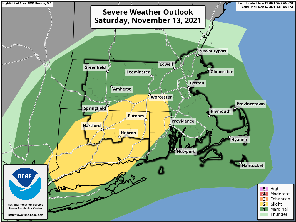 Good morning everyone, The Storm Prediction Center has upgraded parts of our area to Slight risk for severe weather. Key messages remain the same as before with the primary hazard remaining brief damaging wind gusts of up to 60 mph between 3 and 7 PM. In addition, there is a non-zero chance of a brief tornado. Thank you, Rodney Chai If you have any questions or would like more information, don't hesitate to contact us via this email address, on NWSChat <https://nwschat.weather.gov/>, or at the following: National Weather Service Boston/Norton, MA 46 Commerce Way Norton, MA 02766 508.622.3280 Website <http://www.weather.gov/boston> | Facebook <http://www.facebook.com/NWSBoston> | Twitter <http://www.twitter.com/NWSBoston>