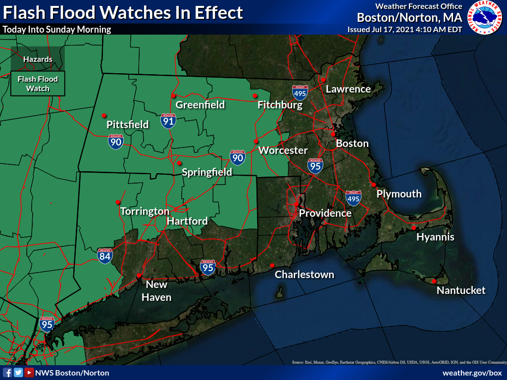 Good afternoon, A Severe Thunderstorm Watch is in effect through 11 PM for western Massachusetts, and much of Connecticut. The main threat is damaging straight line winds gusts and heavy downpours which may lead to flash flooding. In addition, an isolated tornado cannot be ruled out. We've also attached the Flash Flood Watch that remains in effect until late tonight. Thanks, Bill Leatham If you have any questions or would like more information, don't hesitate to contact us via this email address, on NWSChat <https://nwschat.weather.gov/>, or at the following: National Weather Service Boston/Norton, MA 46 Commerce Way Norton, MA 02766 508.622.3280 Website <http://www.weather.gov/boston> | Facebook <http://www.facebook.com/NWSBoston> | Twitter <http://www.twitter.com/NWSBoston>