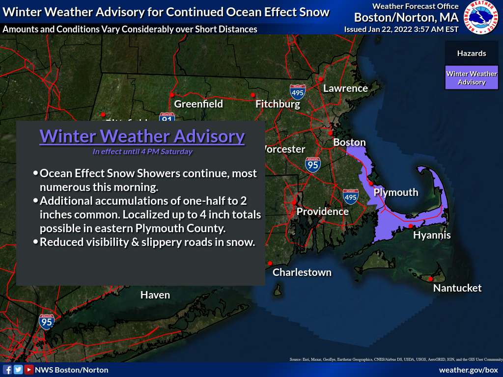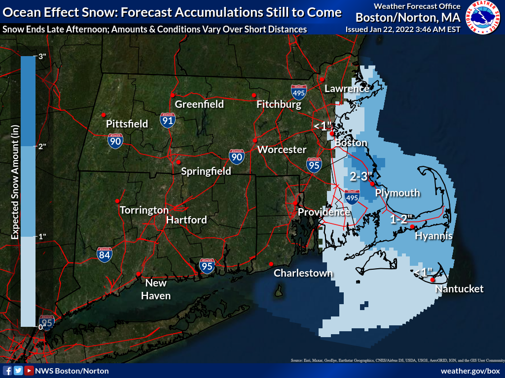 [2022.01.22 AM] NWS Boston EM Briefing: Accumulating Ocean Effect Snow Showers Continue for South Shore & Cape Cod Thru This Afternoon