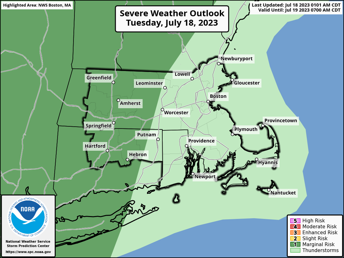 Good morning everyone, Attached is a one-pager briefing which provides information on the localized flash flood threat across western-central MA into northwest CT Tuesday afternoon and evening. There is also a low chance of severe thunderstorms across this region, with localized wind damage and hail being the main hazards. Farther east into RI and northeast MA, including the Providence to Boston corridor, dry weather may prevail today. We have also attached a Flood Watch graphic, latest rainfall forecast and severe weather outlook. If you have any questions or would like more information, don't hesitate to contact us via this email address, on NWSChat <https://nwschat.weather.gov/>, or at 508.622.3280. Frank Nocera & Matt Belk National Weather Service Boston/Norton, MA 46 Commerce Way Norton, MA 02766 508.622.3280 Website <http://www.weather.gov/boston> | Facebook <http://www.facebook.com/NWSBoston> | Twitter <http://www.twitter.com/NWSBoston>