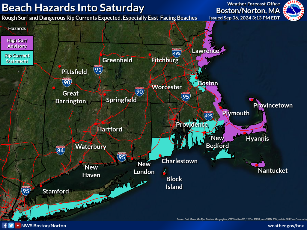 Good afternoon, all: Attached are the latest briefing regarding the high surf and rip current risk, as well as a map of the current beach hazards. The next briefing will be issued Saturday afternoon, or sooner if conditions warrant. Matthew Belk, Caity Mensch and Torry Dooley If you have any questions or would like more information, please don't hesitate to contact us. You can reach us via: email: box.operations@noaa.gov phone: 508.622.3280 Slack/NWSChat 2.0 <https://nwschatws.slack.com/> (for approved partners) social media: Website <http://www.weather.gov/boston> | Facebook <http://www.facebook.com/NWSBoston> | Twitter <http://www.twitter.com/NWSBoston>