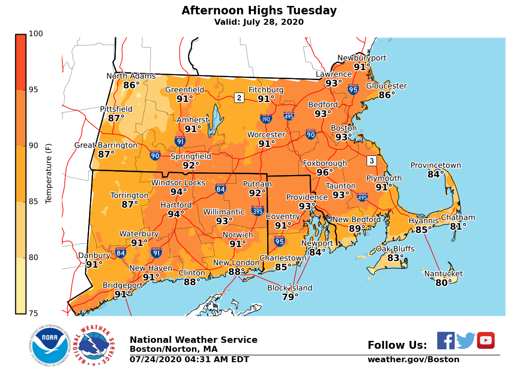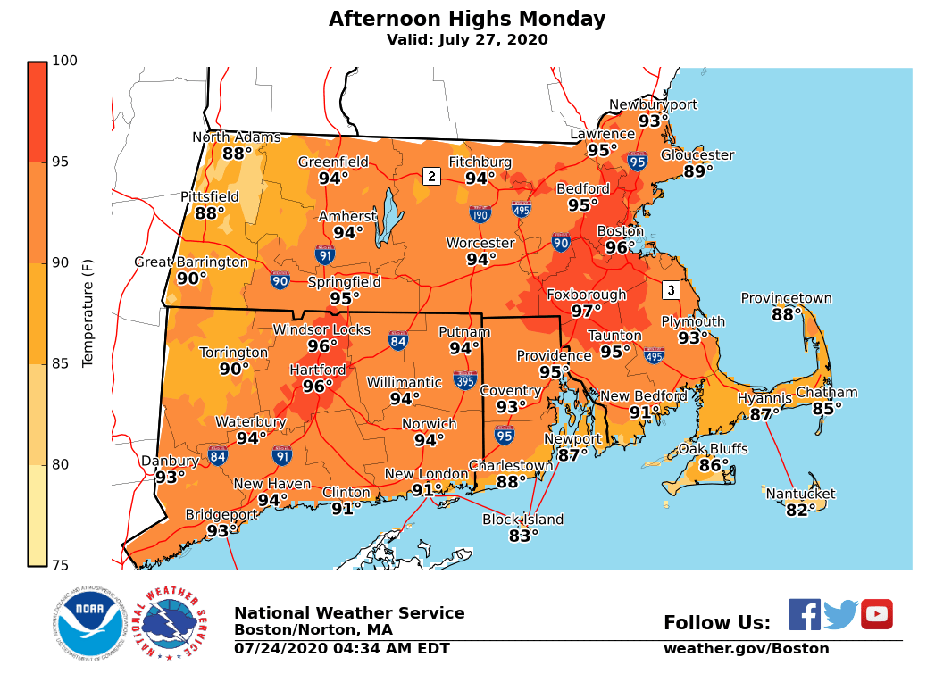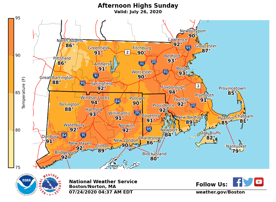 Good morning, We are expecting a three day heat wave Sunday, Monday and Tuesday with afternoon temperatures in the 90s each day. *What: *Extreme heat *Where: *northern portions of CT/RI and most of MA including the cities of Hartford, Providence, Boston and Springfield. However on Monday the extreme heat will be most widespread, even impacting the high terrain. *When:* Sunday, Monday and Tuesday. The extreme heat will likely peak on Monday with highs 95 to 100 possible. *Forecast Confidence:* forecast temperatures have been trending warmer the past few days for Sunday, Monday and Tuesday. Therefore forecast confidence is above average for high temperatures to exceed 90 degrees each of those days along with a low probability of a few locations nearing 100 Monday. Attached are three graphics with expected highs for Sunday, Monday and Tuesday. Meteorologists Frank Nocera & Rodney Chai If you have any questions or would like more information, don't hesitate to contact us via this email address, on NWSChat <https://nwschat.weather.gov/>, or at the following: National Weather Service Boston/Norton, MA 46 Commerce Way Norton, MA 02766 508.622.3280 Website <http://www.weather.gov/boston> | Facebook <http://www.facebook.com/NWSBoston> | Twitter <http://www.twitter.com/NWSBoston>