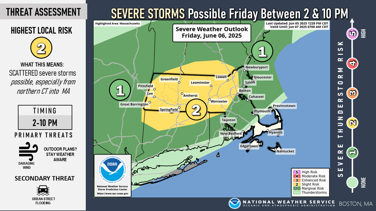 Good Afternoon, Attached is a one-pager and a supporting image showing the potential for severe thunderstorms and urban flash flooding Friday afternoon and evening, between 2 PM and 8 PM. Our confidence in severe thunderstorms is highest near and north of the Mass Pike (I-90) where storms should be more numerous, but we can't rule out severe storms across northern Connecticut and the northwest corner of Rhode Island. The next briefing will be emailed Friday morning by 8 AM. Thanks, Joe Dellicarpini and Francis Tarasiewicz If you have any questions or would like more information, please don't hesitate to contact us. You can reach us via: email: box.operations@noaa.gov phone: 508.622.3280 Slack/NWSChat 2.0 <https://nwschatws.slack.com/> (for approved partners) social media: Website <http://www.weather.gov/boston> | Facebook <http://www.facebook.com/NWSBoston> | Twitter <http://www.twitter.com/NWSBoston>