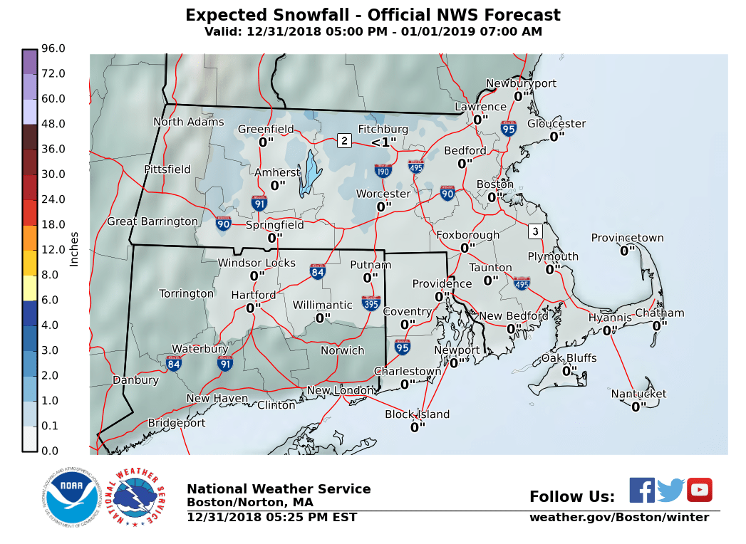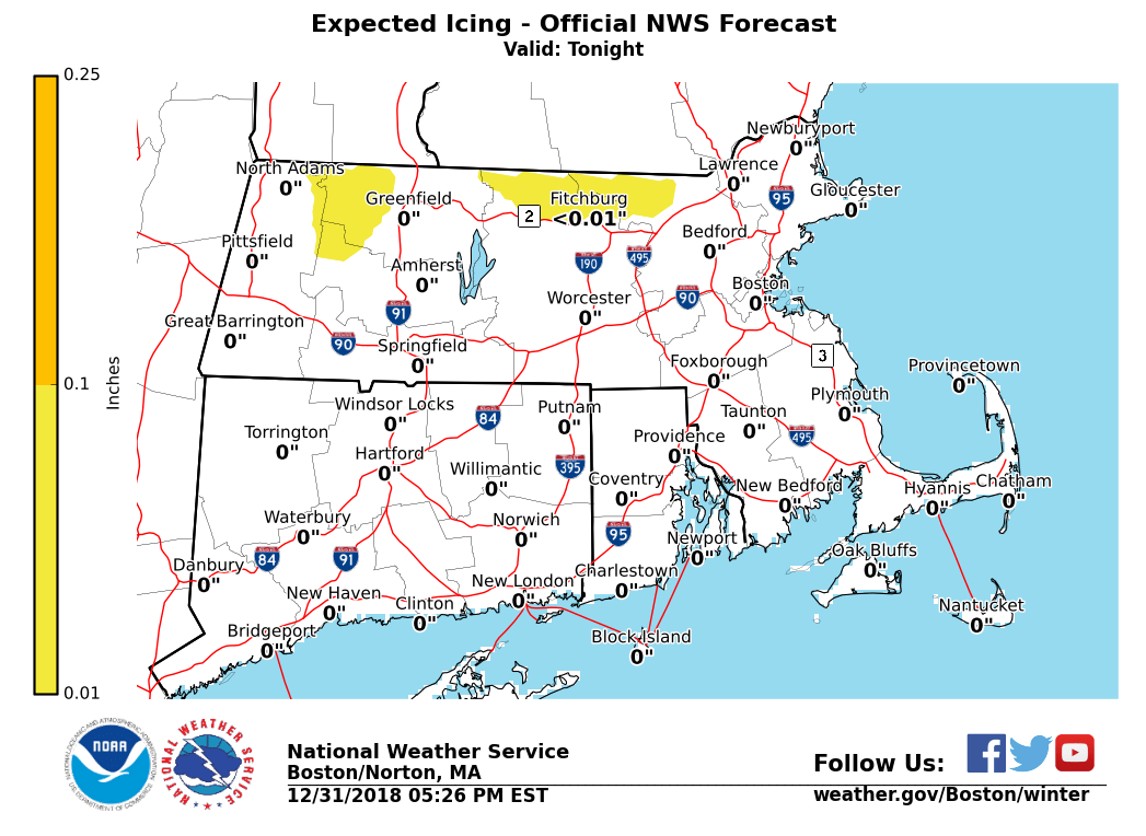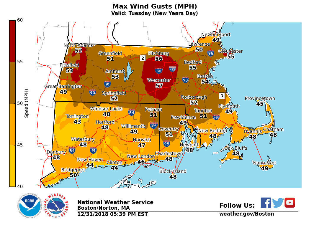 Hi everyone, (Attached are the new graphics). Here is a quick update on the storm system affecting us tonight and New Years Day. Not much has changed from the previous thinking. Rain has begun in southwest CT already and it will overspread the region tonight ' with a widespread inch or so of rain expected. Expecting it to start as a brief period of mixed snow or freezing rain in the east slopes of the Berkshires and northern Worcester hills before becoming all rain after about midnight. Temperatures as of 5 PM were in the mid 30s in those areas. A few slick spots are possible, but only a trace to a few hundredths of an inch of glaze are forecast, along with a coating to less than an inch of snow. A Winter Weather Advisory remains in effect for those areas. Much more importantly, strong to damaging winds are forecast for New Years Day across the entire area. West winds will gust to 40-60 mph across the region. If we had to pinpoint the potential strongest areas, it would be from Worcester County into northeast MA, where we have upgraded to a High Wind Warning. All other areas are in a Wind Advisory. Happy New Year from NWS - Norton! If you have any questions or would like more information, don't hesitate to contact us via this email address, on NWSChat <https://nwschat.weather.gov/>, or at the following: National Weather Service Boston/Norton, MA 46 Commerce Way Norton, MA 02766 508.622.3280 Website <http://www.weather.gov/boston> | Facebook <http://www.facebook.com/NWSBoston> | Twitter <http://www.twitter.com/NWSBoston> If you have any questions or would like more information, don't hesitate to contact us via this email address, on NWSChat <https://nwschat.weather.gov/>, or at the following: National Weather Service Boston/Norton, MA 46 Commerce Way Norton, MA 02766 508.622.3280 Website <http://www.weather.gov/boston> | Facebook <http://www.facebook.com/NWSBoston> | Twitter <http://www.twitter.com/NWSBoston>