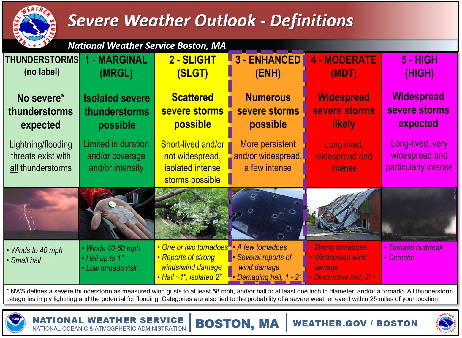 Good morning everyone, We are still expecting a round of strong to severe thunderstorms to move through southern New England this afternoon and evening. The main line of storms has trended a bit slower, decreasing the threat a bit. This would bring the main line of storms through after 7 PM, while there remains a threat for a few isolated storms out ahead of the main line during the afternoon. *Threats:* Main threat - Damaging winds In addition to damaging winds there is also a threat of large hail, dangerous cloud to ground lightning, an isolated tornado, and heavy rain may lead to street flooding. *Timing and Threat Area:* 3-7PM: A few Isolated storms possible anywhere (lesser sever threat) 7-10 PM: Northern MA, mainly north of the MA Pike and west of I-495 Thank You, Bryce Williams and Frank Nocera If you have any questions or would like more information, don't hesitate to contact us via this email address, on NWSChat <https://nwschat.weather.gov/>, or at the following: National Weather Service Boston/Norton, MA 46 Commerce Way Norton, MA 02766 508.622.3280 Website <http://www.weather.gov/boston> | Facebook <http://www.facebook.com/NWSBoston> | Twitter <http://www.twitter.com/NWSBoston>