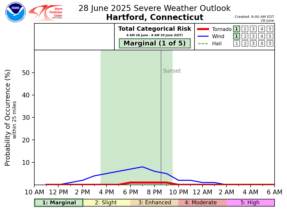 Good morning everyone, The threat for severe weather has increased slightly (from level 1 -> 2) from our previous forecast for western MA & CT along the NY border. These storms are expected to weaken to just showers as the activity enters RI and eastern MA this evening. The attached timing graphics indicate the time frame for storms is between 4 PM and 10 PM, with highest probabilities between 6 PM and 9 PM. The main threat is damaging winds. However, there is a 2-4% probability of an isolated tornado. Also, some storms may contain brief heavy rainfall. Let us know if you have any questions. Frank Nocera If you have any questions or would like more information, please don't hesitate to contact us. You can reach us via: email: box.operations@noaa.gov phone: 508.622.3280 Slack/NWSChat 2.0 <https://nwschatws.slack.com/> (for approved partners) social media: Website <http://www.weather.gov/boston> | Facebook <http://www.facebook.com/NWSBoston> | Twitter <http://www.twitter.com/NWSBoston>