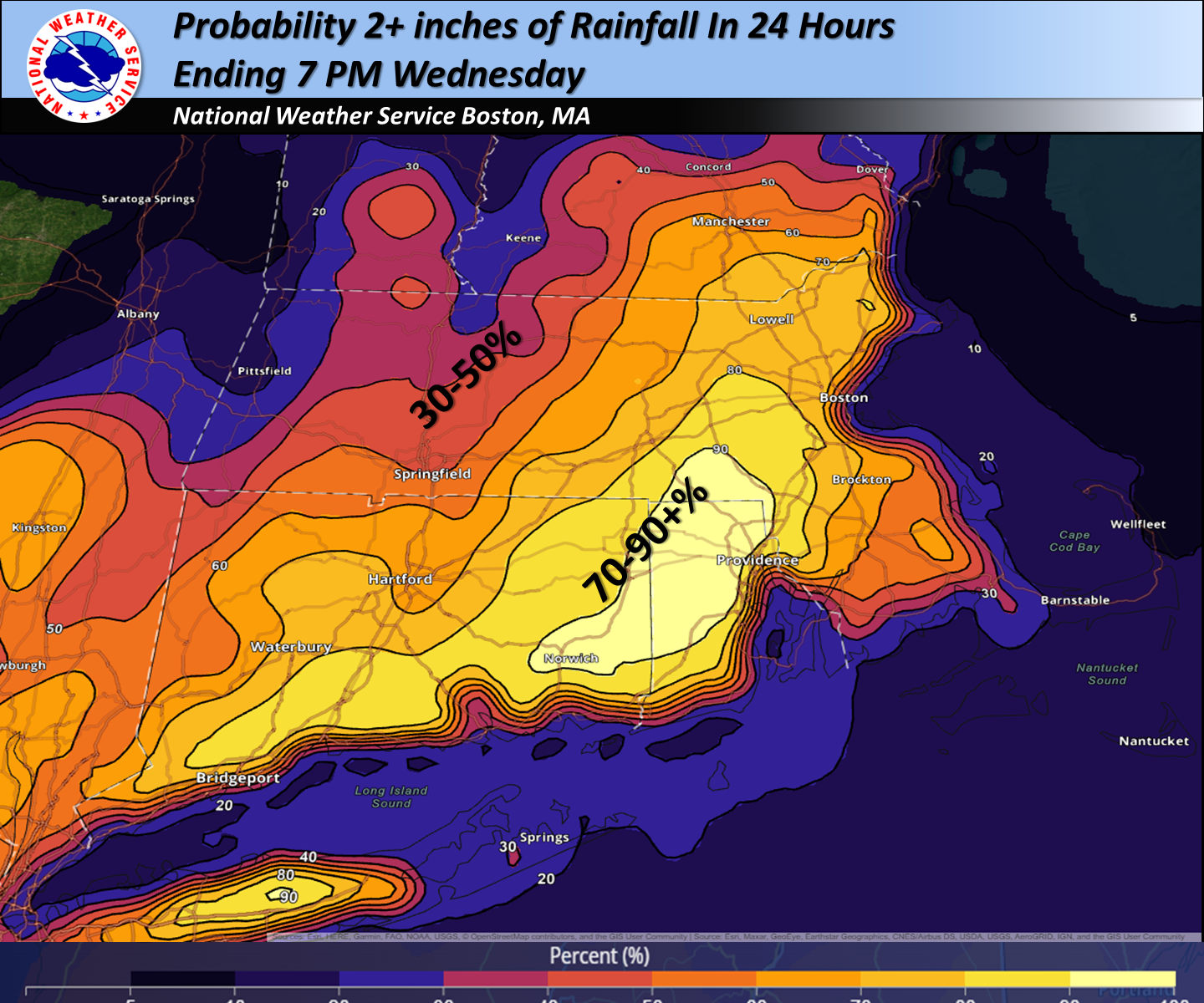 Good afternoon, all: While we are still dealing with the lingering effects of today's storm, we do need to highlight a storm expected sometime Tuesday night into Wednesday. This storm has the potential to bring strong gusty winds of 50-70 mph, and several inches of rainfall. Details will come into better focus over the next couple of days. The attached image, also included in the briefing, is the probability of 2+ inches of rainfall within 24 hours, ending 7 PM Wednesday, from our National Blend of Models ensemble system. Matthew Belk If you have any questions or would like more information, please don't hesitate to contact us. You can reach us via: email: box.operations@noaa.gov phone: 508.622.3280 Slack/NWSChat 2.0 <https://nwschatws.slack.com/> (for approved partners) social media: Website <http://www.weather.gov/boston> | Facebook <http://www.facebook.com/NWSBoston> | Twitter <http://www.twitter.com/NWSBoston>