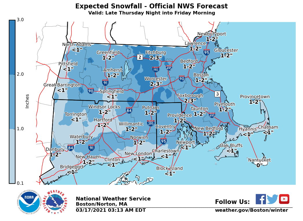 Good Morning Everyone, Attached is a one-page briefing and snowfall graphic covering Thursday night into Friday for the potential of strong winds and a light accumulation of snow. Right now this looks like a minor event (1 to 3 inches) with little impact to the Friday morning commute, but the difference of a few degrees in temperature could result in more snow (perhaps 3-5" in some spots with more impact) or little if any snow. The other concern is for strong northeast winds possibly gusting as high as 40 to 50 MPH near the coast and on the coastal waters. Gale Watches have been issued for the coastal waters. Please feel free to contact us with any questions or concerns. Thanks, Joe DelliCarpini and Kevin Cadima If you have any questions or would like more information, don't hesitate to contact us via this email address, on NWSChat <https://nwschat.weather.gov/>, or at the following: National Weather Service Boston/Norton, MA 46 Commerce Way Norton, MA 02766 508.622.3280 Website <http://www.weather.gov/boston> | Facebook <http://www.facebook.com/NWSBoston> | Twitter <http://www.twitter.com/NWSBoston>