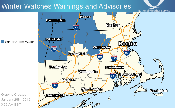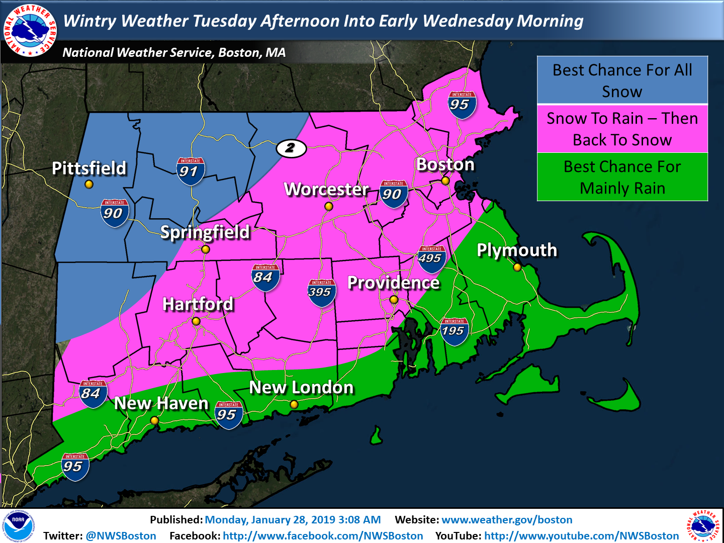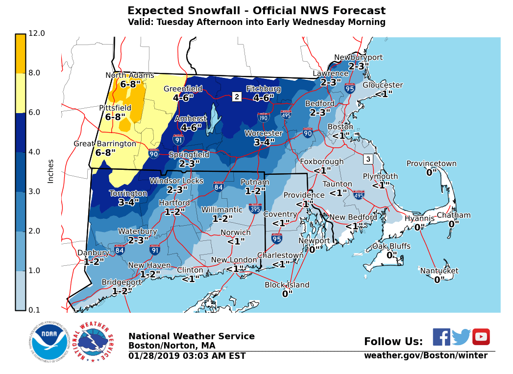 Good Morning, We have attached our latest snowfall and precipitation type forecasts for Tuesday afternoon into Wednesday. *Changes:* - Winter Storm Watch issued from the east slopes of the Berkshires into northern Worcester County for the possibility of 4 to 8 inches of snow. *Timeline:* - Snow begins Tuesday afternoon in western New England and reaches the coast early Tuesday evening. - Snow may be heavy at times from the Berkshires to northern Worcester County Tuesday night. - Snow quickly changes to rain Tuesday night in Providence and Boston with little accumulation. - Snow should mix with, or possibly change to rain as far inland as Hartford, Springfield, Worcester, and Lawrence Tuesday night where a few inches of snow should accumulate. - Colder air arrives before daybreak Wednesday morning, resulting in a change back to snow for most of southern New England before ending. - Gale force NW winds and light to moderate freezing spray on the MA/RI waters Wednesday through Thursday morning. *Uncertainty:* - How far inland the rain/snow line gets Tuesday night. - We should know more in time for the next update (by 5 PM today) If you have any questions or would like more information, don't hesitate to contact us via this email address, on NWSChat <https://nwschat.weather.gov/>, or at the following: National Weather Service Boston/Norton, MA 46 Commerce Way Norton, MA 02766 508.622.3280 Website <http://www.weather.gov/boston> | Facebook <http://www.facebook.com/NWSBoston> | Twitter <http://www.twitter.com/NWSBoston> Thanks, Joe DelliCarpini and Bill Babcock
