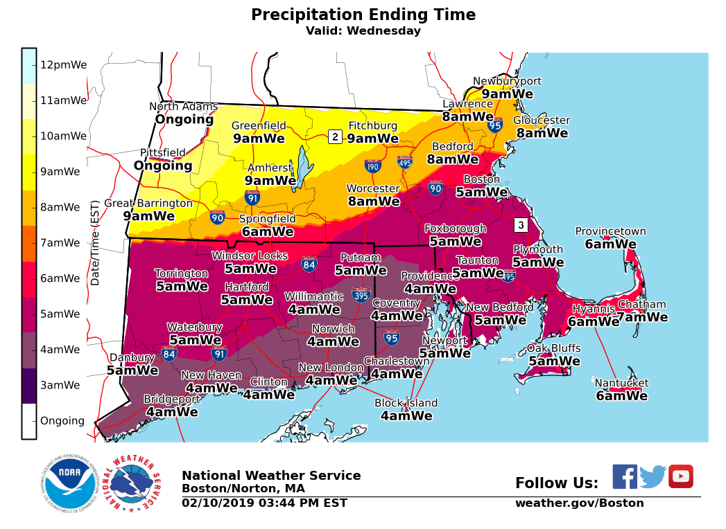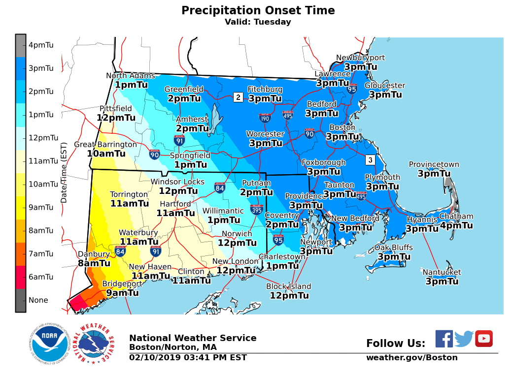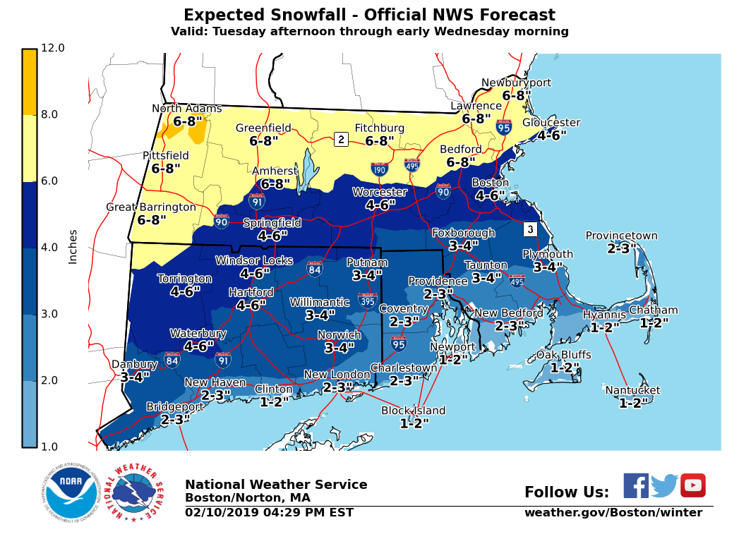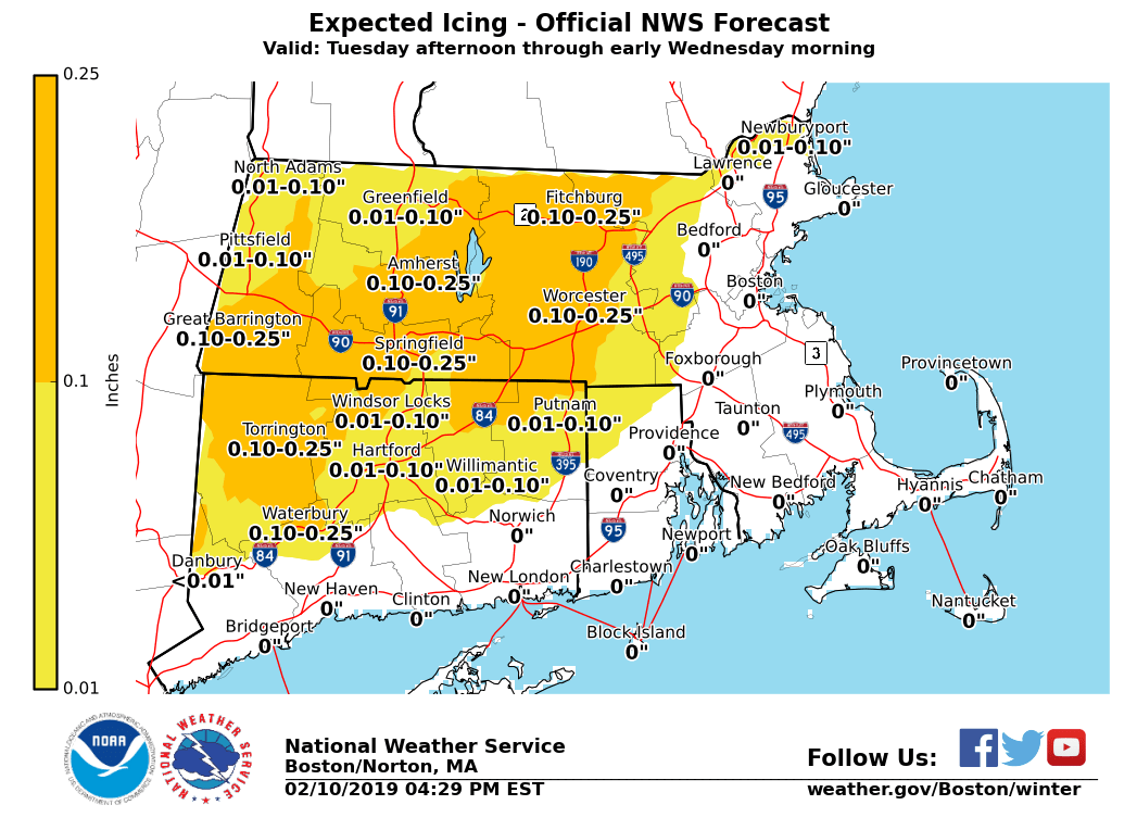 Good afternoon, Our apologies but the dates on the snow and ice graphics should say Tuesday afternoon through early Wednesday morning. Attached are the graphics with the correct dates. Thank you, NWS Boston If you have any questions or would like more information, don't hesitate to contact us via this email address, on NWSChat <https://nwschat.weather.gov/>, or at the following: National Weather Service Boston/Norton, MA 46 Commerce Way Norton, MA 02766 508.622.3280 Website <http://www.weather.gov/boston> | Facebook <http://www.facebook.com/NWSBoston> | Twitter <http://www.twitter.com/NWSBoston> On Sun, Feb 10, 2019 at 4:00 PM BOX Operations - NOAA Service Account < box.operations@noaa.gov> wrote: