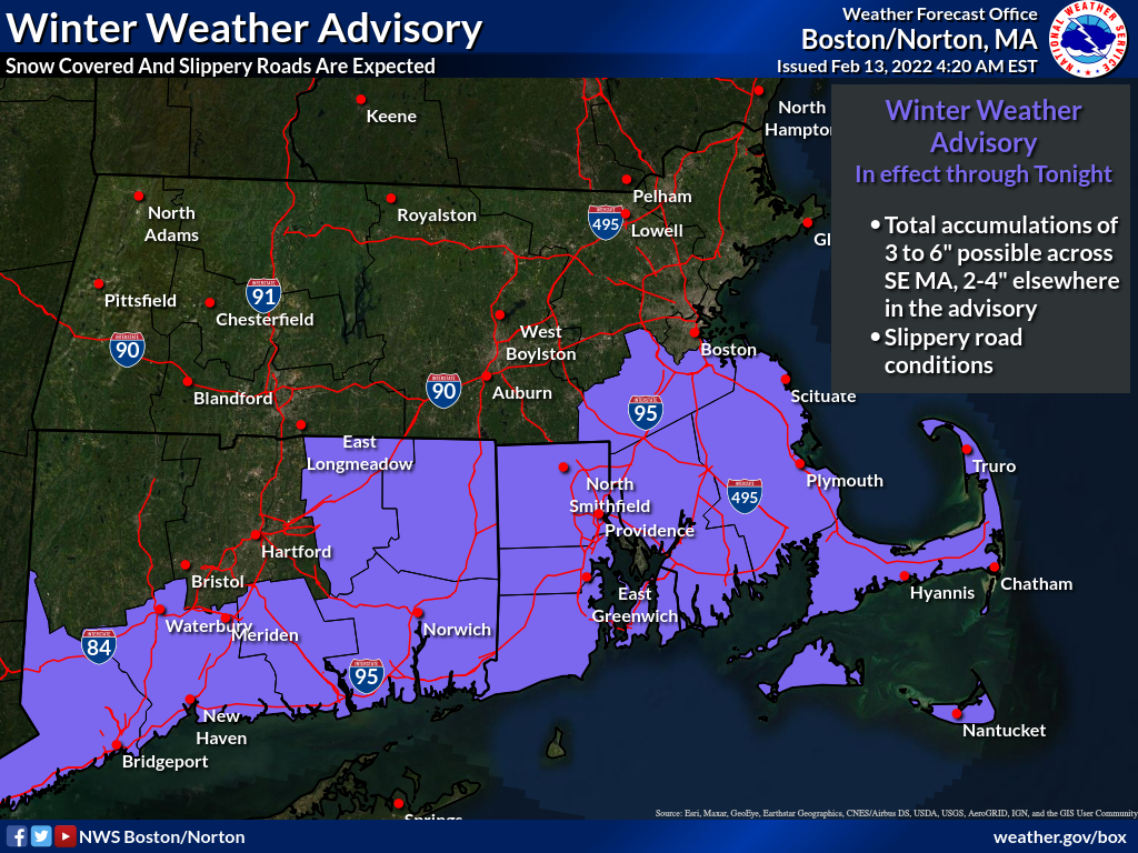 Good morning, We apologize for the second email. We omitted Bristol County RI and Block Island from the previous Winter Weather Advisory graphic. The attached image will fix that error. No other changes to the forecast have been made. Matthew Belk If you have any questions or would like more information, don't hesitate to contact us via this email address, on NWSChat <https://nwschat.weather.gov/>, or at the following: National Weather Service Boston/Norton, MA 46 Commerce Way Norton, MA 02766 508.622.3280 Website <http://www.weather.gov/boston> | Facebook <http://www.facebook.com/NWSBoston> | Twitter <http://www.twitter.com/NWSBoston> On Sun, Feb 13, 2022 at 4:29 AM BOX Operations - NOAA Service Account < box.operations@noaa.gov> wrote: