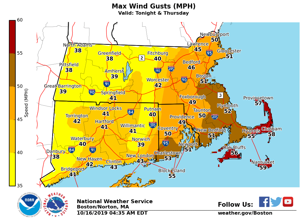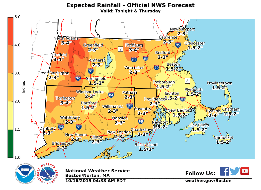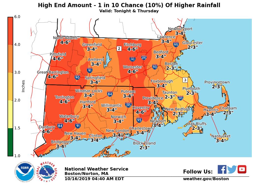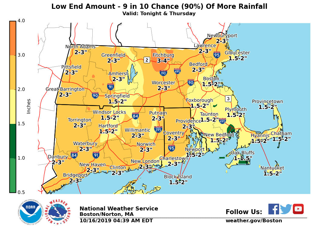 Good morning everyone, Here is our latest update on a powerful coastal storm to impact MA, RI & CT tonight into Thursday morning. *What/When & Where ...* *Headlines ...* - *High Wind Watch - *Cape Cod & Islands Thursday - *Wind Advisories - *south coast of RI and eastern MA coast including Boston tonight then all of RI and eastern MA Thursday *Strong to Damaging Wind Threat ...* - *When* - two surges of wind are expected with the first surge tonight (east winds) followed by a stronger surge Thursday morning and afternoon (west winds) - *Where* - RI into eastern MA but strongest wind over Cape Cod and Islands - *Impacts* - winds potentially strong enough to down tree limbs and result in power outages. Greatest threat over Cape Cod and the Islands - *Uncertainty* - how much strong wind aloft will mix down to the surface and areal extent. Trees remaining fully leaved will require less wind for damage to occur. *Heavy Rainfall Threat & Poor Drainage Flooding ...* - *When* - Heaviest rain approximately 10 pm Wednesday to 6 am Thursday from southwest to northeast - *Where* - all of MA, RI and CT - *Impacts* - a widespread 1.5 to 3 inches of rain with localized amounts of 4 to 5 inches possible. Given the relatively recent dry weather river and stream flows are running at or below normal. Therefore the only flooding expected is poor drainage/urban-street flooding. What may minimize any flooding impacts is the heaviest rainfall is expected to occur in between rush hours, after the late day commute today and before the Friday morning commute - *Uncertainty* - areal extent of 4 to 5 inch rainfall amounts are uncertain. Low and high end rainfall maps attached along with mostly likely rainfall amounts to help communicate this uncertainty Frank Nocera If you have any questions or would like more information, don't hesitate to contact us via this email address, on NWSChat <https://nwschat.weather.gov/>, or at the following: National Weather Service Boston/Norton, MA 46 Commerce Way Norton, MA 02766 508.622.3280 Website <http://www.weather.gov/boston> | Facebook <http://www.facebook.com/NWSBoston> | Twitter <http://www.twitter.com/NWSBoston>