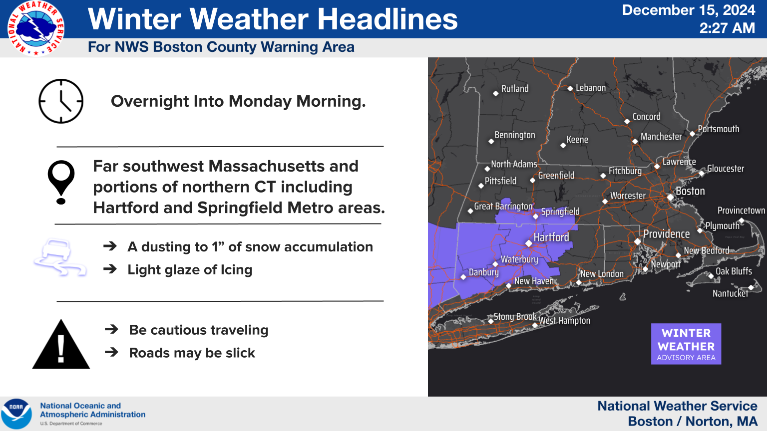 Good morning everyone! We wanted to let you know we issued a Winter Weather Advisory from 1 AM to 11 AM Monday for southwest Massachusetts and northern Connecticut. A mixture of light snow and light freezing rain/freezing drizzle may result in an icy Monday morning commute including the Hartford to Springfield Metro area. Any snow accumulations will be quite light on the order of a dusting to 1", but areas of light freezing rain/freezing drizzle may result in a light glaze of ice on untreated roadways. Attached is a brief one-pager as well as an image of the Winter Weather Advisory and the ice accretion forecast. Thank You! Meteorologist: Hayden Frank If you have any questions or would like more information, please don't hesitate to contact us. You can reach us via: email: box.operations@noaa.gov phone: 508.622.3280 Slack/NWSChat 2.0 <https://nwschatws.slack.com/> (for approved partners) social media: Website <http://www.weather.gov/boston> | Facebook <http://www.facebook.com/NWSBoston> | Twitter <http://www.twitter.com/NWSBoston>