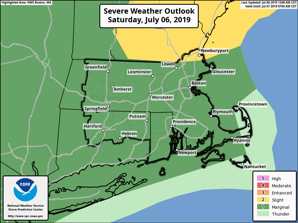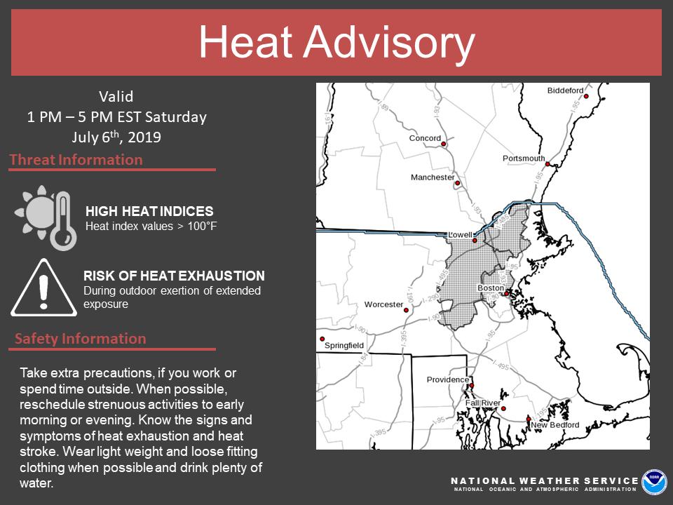 Good morning everyone, Outlined below are potential weather hazards this afternoon and evening. *What ...* Potential severe thunderstorms with torrential downpours, localized flooding, and strong winds are possible. Also, excessive heat and humidity is expected this afternoon with heat indices approaching or exceeding 100 degrees, thus a Heat Advisory has been posted for a portion of the area. *Where ... *For severe thunderstorms, all of Connecticut into northern Rhode Island and all of northern Massachusetts including the city of Boston. The risk of strong storms is lower across the south coast of MA and RI. A heat advisory has been posted for northeast Massachusetts including Metro-West. *When ... *The risk for potential severe thunderstorms exist between 1 pm and 10 pm, however the greatest risk is between 4 pm and 8 pm. Heat indices approaching or exceeding 100 degrees will occur between 1 pm and 5 pm today. *Forecast Uncertainty ... *areal coverage of strong thunderstorms is not quite clear. Current thinking is storms will be scattered, meaning one town can be impacted by torrential rainfall and localized flooding while a neighboring town has very little to no impact. The threat for strong storms appears to be highest across CT, into northern RI and across all of northern MA including the city of Boston. As for heat indices, depending on the amount of cloud cover today, the combination of very warm temperatures and tropical humidity, heat indices will likely approach or exceed 100 degrees. Attached are four graphics to help communicate the areal threat of strong thunderstorms, heavy rainfall/flooding and heat advisory. Frank Nocera & Bryce Williams If you have any questions or would like more information, don't hesitate to contact us via this email address, on NWSChat <https://nwschat.weather.gov/>, or at the following: National Weather Service Boston/Norton, MA 46 Commerce Way Norton, MA 02766 508.622.3280 Website <http://www.weather.gov/boston> | Facebook <http://www.facebook.com/NWSBoston> | Twitter <http://www.twitter.com/NWSBoston>