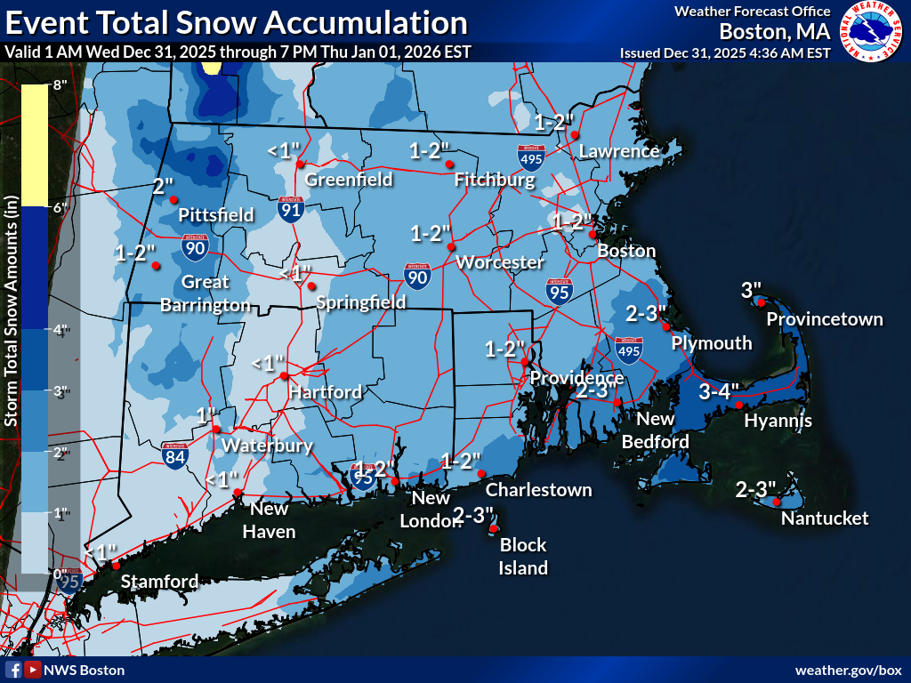 Good morning, all: Here is the latest update for tonight's snowfall. - *Advisory Expansion:* Cape Cod is now included in the Winter Weather Advisory. The advisory continues for the Vineyard and Nantucket. - *Expected Accumulation:* Total snowfall of *2–4 inches* is anticipated in the advisory area. - *Peak Timing:* The greatest concern is between *1 AM and 6 AM*, featuring periods of steady snow. - *Heavy Bursts:* Snowfall rates could reach *1 inch per hour* across southern RI and southeast MA, potentially reducing visibility. - *Road Conditions:* Brief heavy bursts may quickly create *slick and hazardous travel conditions*. - *Holiday Impact:* The timing coincides with *New Year’s Eve celebrations* ending, increasing risks for those traveling late tonight and early Thursday morning. - Attached is a map highlighting the expected snowfall amounts. Please let us know if you have any questions or need additional support as this event unfolds. - Happy New Year! Meteorologist Matthew Belk If you have any questions or would like more information, please don't hesitate to contact us. You can reach us via: email: box.operations@noaa.gov phone: 508.622.3280 Slack/NWSChat 2.0 <https://nwschatws.slack.com/> (for approved partners) social media: Website <http://www.weather.gov/boston> | Facebook <http://www.facebook.com/NWSBoston> | Twitter <http://www.twitter.com/NWSBoston>