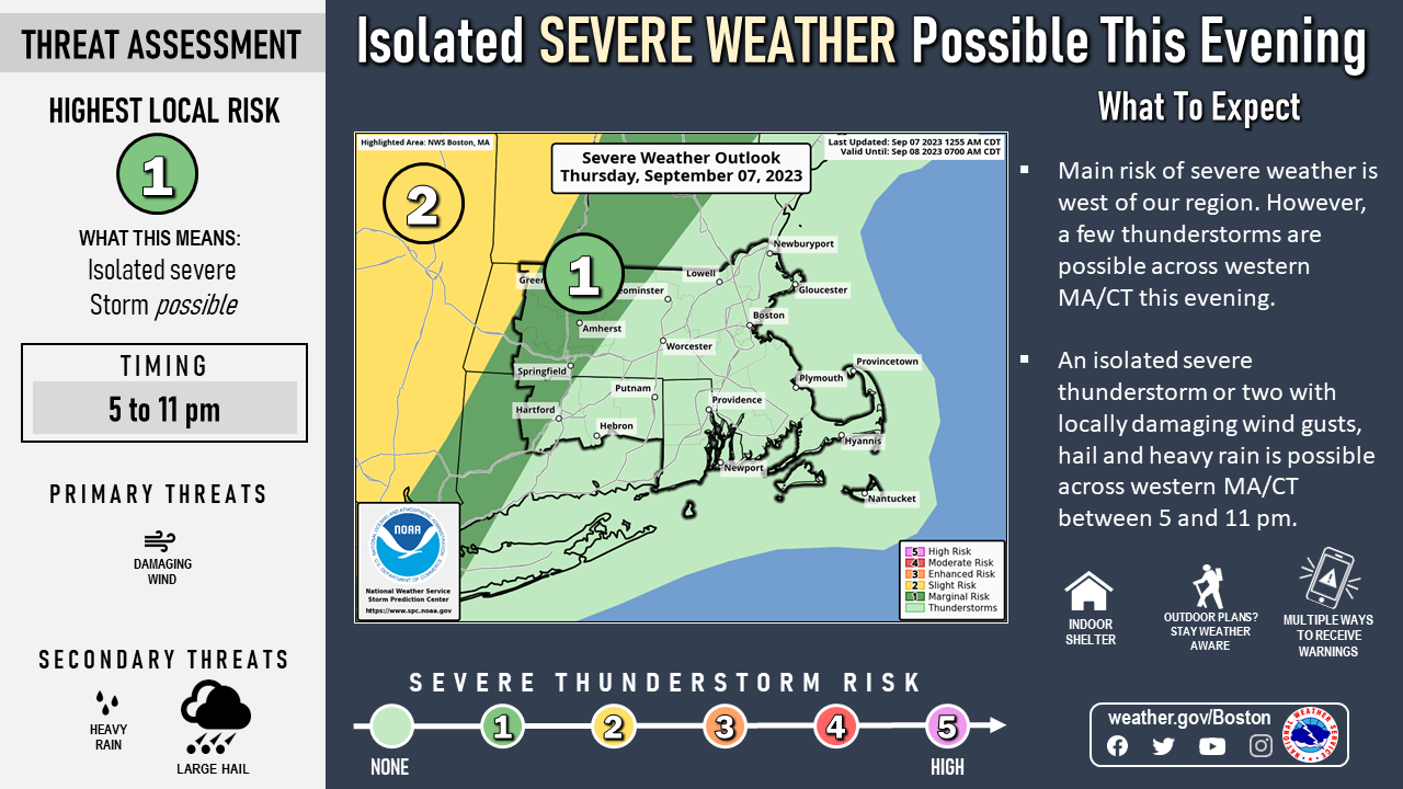 Good morning everyone The only real change with this forecast update was to shift the main severe weather threat west of our region this evening. However, an isolated severe thunderstorm or two can not be ruled out across western MA/western CT roughly between 5 and 11 pm this evening. The main threat would be isolated damaging wind gusts. Otherwise, Heat Advisories continue for most of the region away from the immediate coast today and Friday. The heat peaks today with heat indices near 100 this afternoon, but still expect those values to reach into the middle 90s on Friday. Attached is a graphic indicating the main risk of severe weather will be to our west, but an isolated severe storm or two can not be ruled out. We have also attached a map of the Heat Advisories along with the expected Heat Indices Today and Friday. Please let us know if you have any questions or concerns. Thank You! Meteorologists: Hayden Frank and Robert Megnia If you have any questions or would like more information, please don't hesitate to contact us. You can reach us via: email: box.operations@noaa.gov phone: 508.622.3280 Slack/NWSChat 2.0 <https://nwschatws.slack.com/> (for approved partners) social media: Website <http://www.weather.gov/boston> | Facebook <http://www.facebook.com/NWSBoston> | Twitter <http://www.twitter.com/NWSBoston>
