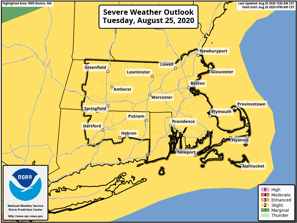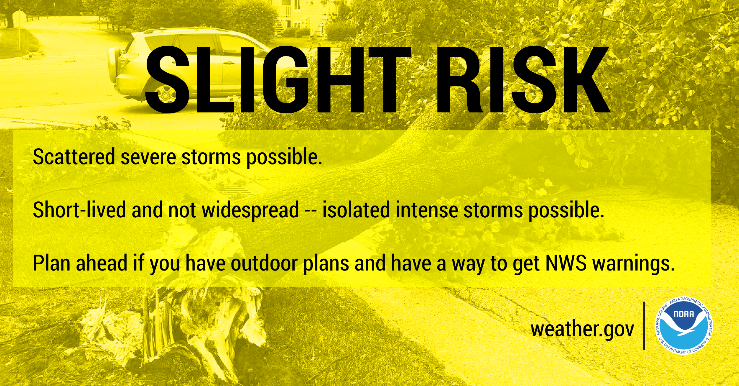 Good morning everyone, Risk for scattered strong to severe thunderstorms this afternoon continues. No major changes were made with this update. *Where* All of southern New England but the greatest threat across CT, RI and southeast MA. *Threats* Damaging wind gusts, large hail and heavy downpours *When* Noon to 8 PM *Confidence * Confidence is above average for at least a few strong to severe thunderstorms. However there is uncertainty if the severe storms will be more widespread. For example, will storms organize into a squall line and impact a larger area? At the very least we are expecting a few strong to severe storms. *Attachments * SPC has kept southern New England in a slight risk, which indicates the potential for scattered strong to severe storms. If confidence increases on more widespread severe weather SPC may increase the risk from slight to enhanced. Also attached is a model radar simulation (not to be exact) indicating how storms may evolve this afternoon. The loop begins at 11 am and ends at 8 pm. Frank Nocera & Kevin Cadima If you have any questions or would like more information, don't hesitate to contact us via this email address, on NWSChat <https://nwschat.weather.gov/>, or at the following: National Weather Service Boston/Norton, MA 46 Commerce Way Norton, MA 02766 508.622.3280 Website <http://www.weather.gov/boston> | Facebook <http://www.facebook.com/NWSBoston> | Twitter <http://www.twitter.com/NWSBoston>
