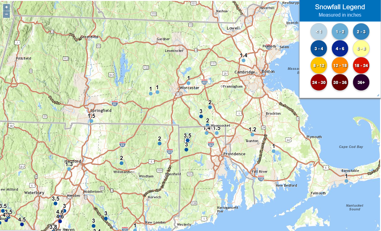 Good afternoon, Following is a short update to our briefing materials based on the latest information and forecast trends. Bands of moderate to heavy snow have now overspread most of CT, RI and MA as of early this afternoon. Thus far, anywhere from one-half inch to as much as 3.5 inches of snow have fallen across the area. As of early this afternoon, this has prompted an upgrade to Winter Storm Warnings for Suffolk, Norfolk and Dukes Counties in MA. Remaining active winter weather headlines are unchanged. Attached graphics, updated as of 130 PM, include a graphical view of snow reports received as of 1 PM, the expected snow still to come, and the current active headlines in effect to reflect the upgrade as described above. Unless conditions warrant otherwise, this is likely to be the last briefing. Thank You! Meteorologists: Andrew Loconto, Bill Babcock, Rodney Chai, and Rob Megnia If you have any questions or would like more information, don't hesitate to contact us via this email address, on NWSChat <https://nwschat.weather.gov/>, or at the following: National Weather Service Boston/Norton, MA 46 Commerce Way Norton, MA 02766 508.622.3280 Website <http://www.weather.gov/boston> | Facebook <http://www.facebook.com/NWSBoston> | Twitter <http://www.twitter.com/NWSBoston>