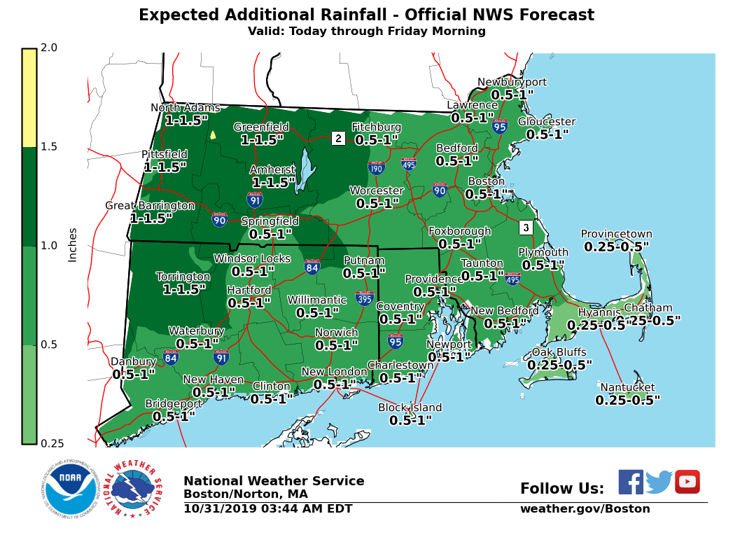 - *Timing:* Ongoing periods of showers to continue today. The heaviest rainfall, possibly accompanied by a rumble or two of thunder, will be between midnight and 3 am in western/central MA and northern CT; and 4-6 AM in eastern MA and RI. - *Additional Amounts:* 0.25 to 1.5 inches today into the overnight, heaviest interior. - *Impacts*: Limited. Isolated poor drainage flooding possible from leaf-clogged storm drains. - *Uncertainty*: Areas of thunder could enhance rainfall rates.