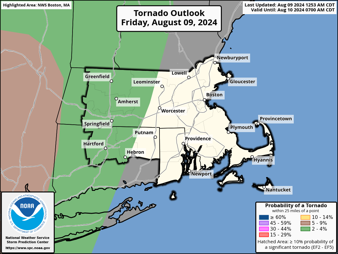 Good morning, Following is an update from yesterday's weather briefing regarding our latest expectations for severe weather potential today and tonight. The remnants of Debby are still expected to pass to the west of New England tonight. There is still a *low risk* of a short-lived tornado in the western third of Massachusetts (west of Worcester) and in the western two-thirds of Connecticut. This is reflected in the area highlighted in green in the attached graphic. Severe weather potential could develop as soon as 3 PM, but is more likely between 6 PM today to 1 AM Saturday as Debby's remnants begin to recurve to our west. Unless there are significant changes which would warrant otherwise, this will be the final briefing on this weather situation. Thank You! Meteorologists: Andrew Loconto and Torry Dooley If you have any questions or would like more information, please don't hesitate to contact us. You can reach us via: email: box.operations@noaa.gov phone: 508.622.3280 Slack/NWSChat 2.0 <https://nwschatws.slack.com/> (for approved partners) social media: Website <http://www.weather.gov/boston> | Facebook <http://www.facebook.com/NWSBoston> | Twitter <http://www.twitter.com/NWSBoston>