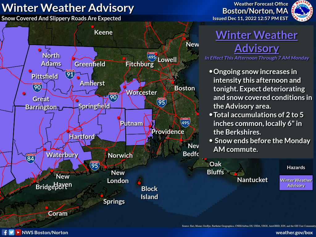 Good afternoon everyone Just wanted to let you know that we opted to expand the Winter Weather Advisory into south central Massachusetts as well as northern Rhode Island, which includes the Worcester and Providence metro areas. We are expecting 2 to 3 inches of snow in this region with localized amounts up to 4 inches through tonight. Otherwise, no significant changes to the early morning forecast. Snow has already arrived in western/central MA and Connecticut and should be moving into eastern MA & RI in the next 1-2 hours. Temperatures are below freezing and the snow will stick on untreated roadways resulting in slippery travel. Attached is our latest snowfall forecast along with a map depicting the Winter Weather Advisory. The accumulating snow is still expected to come to an end before the Monday morning rush hour and this will likely be the last email issued for this event. Thank You! Meteorologists: Hayden Frank, Rob Megnia, and Andrew Loconto If you have any questions or would like more information, don't hesitate to contact us via this email address, on NWSChat <https://nwschat.weather.gov/>, or at the following: National Weather Service Boston/Norton, MA 46 Commerce Way Norton, MA 02766 508.622.3280 Website <http://www.weather.gov/boston> | Facebook <http://www.facebook.com/NWSBoston> | Twitter <http://www.twitter.com/NWSBoston>