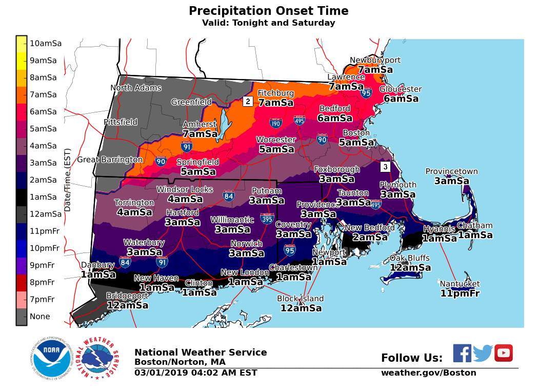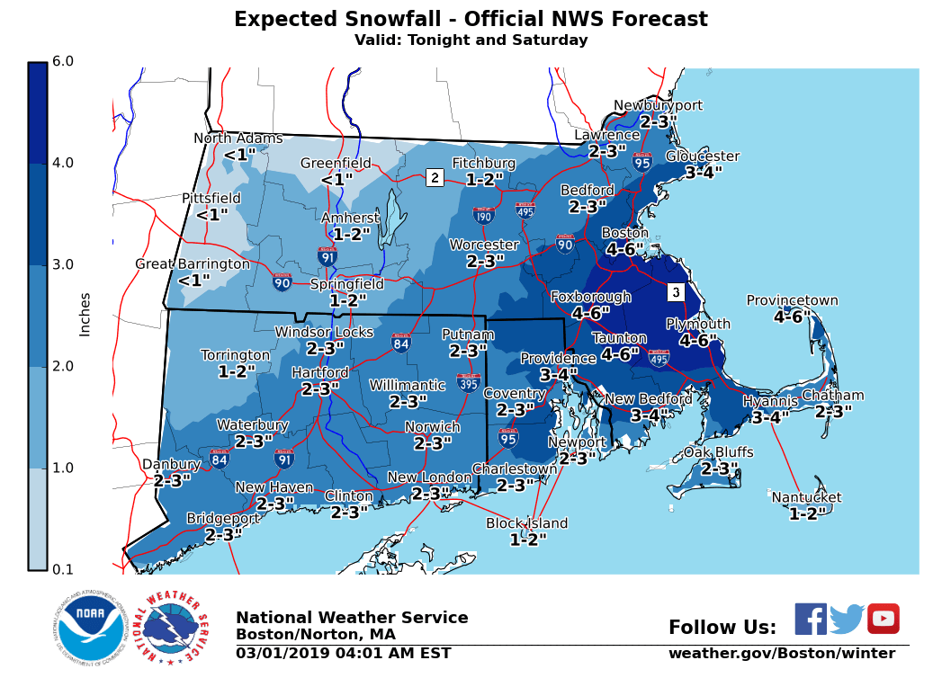 Good Morning, An active pattern is still anticipated this weekend and early next week with the potential for 2 winter storms impacting Southern New England. The first storm will start late tonight and last into Saturday. This will bring the potential for several inches snow accumulation. The second and stronger storm is expected late Sunday into Monday, but there remains considerable uncertainty with the storm track, which will in turn affect the types of precipitation. Details below. *Tonight into Saturday...* *What has changed:* - A Winter Weather Advisory has been issued for parts of Southeast Massachusetts. This includes Suffolk, Norfolk, Northern Bristol, and Interior/Eastern Plymouth Counties. *What/Where/When:* - Potential snowfall of 2 to 6 inches. - Heaviest snowfall expected across interior RI/Southeast MA - Snow develops near the south coast around 9 PM tonight and reaches northern MA toward daybreak Saturday - A brief period of heavy snow with 1-2 inch/hr snowfall rates is possible Sat morning across eastern New England - Hazardous travel conditions with snow covered roads and poor visibility late tonight and Saturday morning - Snowfall will be wet and heavy so risk for power outages will increase if amounts reach 6 inches - Some mixing with rain or sleet possible coastal plain and Cape/Islands Saturday - Snow gradually tapers off west to east during Saturday midday and afternoon *Uncertainty:* - Axis of heaviest snowfall can still change and it is possible max snowfall amounts could exceed 6 inches in some locations. - If storm track trends further north, heavier snowfall will shift further in the interior with more rain near the coast. A further south track would result in more of a glancing blow. - Slight cooling in the atmosphere could result in more significant snow accumulation for the Cape/Islands. *Late Sunday into Monday...* *What has changed:* - Forecast information has trended the forecast storm paths somewhat closer together, but still with lingering and significant differences. *What:* - Significant snow accumulation - Impacts to the Monday morning commute *Where:* - Greatest risk for significant snow will be across the interior, north and west of the Boston to Providence corridor, but significant snow can't be ruled out yet for Boston to Providence *When:* - Snow develops Sunday evening from west to east, possibly heavy at times after midnight - Snow may mix with sleet and change to rain in the coastal plain later Sunday night - Precipitation gradually tapers off during Monday *Uncertainty:* - There is still considerable uncertainty with the storm track which will determine where rain-snow line sets up and where axis of heaviest snow occurs - It is still too early to give specific snowfall amounts - We will know more each day but probably will not have higher confidence in snowfall amounts until Saturday If you have any questions or would like more information, don't hesitate to contact us via this email address, on NWSChat <https://nwschat.weather.gov/>, or at the following: National Weather Service Boston/Norton, MA 46 Commerce Way Norton, MA 02766 508.622.3280 Website <http://www.weather.gov/boston> | Facebook <http://www.facebook.com/NWSBoston> | Twitter <http://www.twitter.com/NWSBoston>