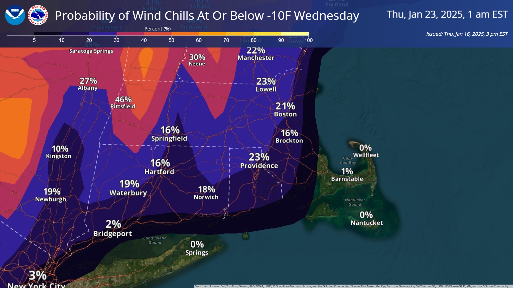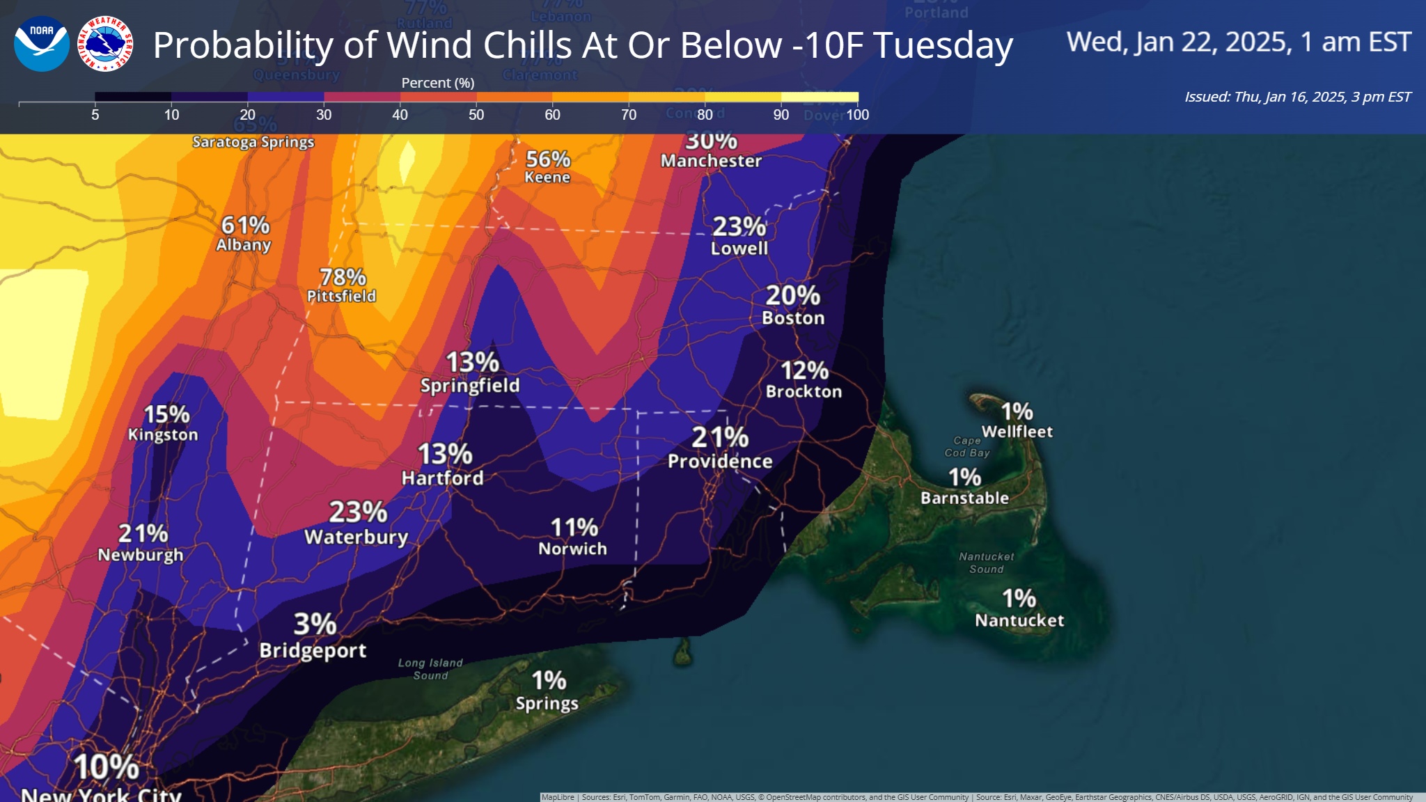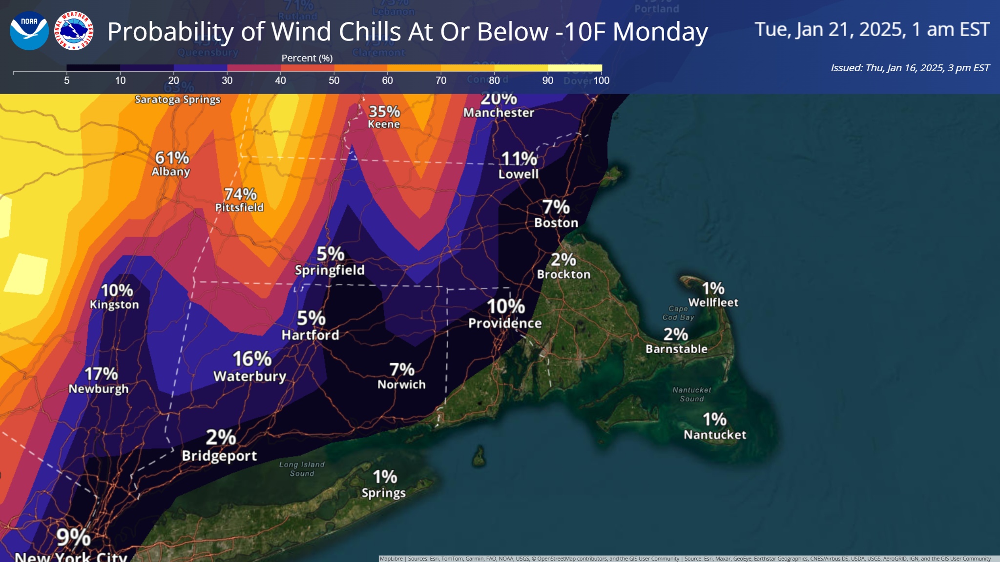 Good afternoon everyone, Here is your updated briefing on a few upcoming bouts of winter weather. While we are still several days away and confidence is on the lower side, there is increasing confidence that southern New England will experience a round of snowfall Sunday evening into Monday. Attached is the current probability of exceeding 3 inches of snow. This will be refined in the coming days. As for next week's arctic outbreak, bitter cold temperatures are still expected early to mid week. We have attached a timeline of expected minimum apparent temperatures as well as probabilities of experiencing apparent temperatures below -10F. Please let us know if you have any questions! Thanks, Bryce Williams and Matthew Belk If you have any questions or would like more information, please don't hesitate to contact us. You can reach us via: email: box.operations@noaa.gov phone: 508.622.3280 Slack/NWSChat 2.0 <https://nwschatws.slack.com/> (for approved partners) social media: Website <http://www.weather.gov/boston> | Facebook <http://www.facebook.com/NWSBoston> | Twitter <http://www.twitter.com/NWSBoston>