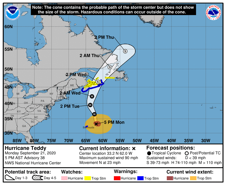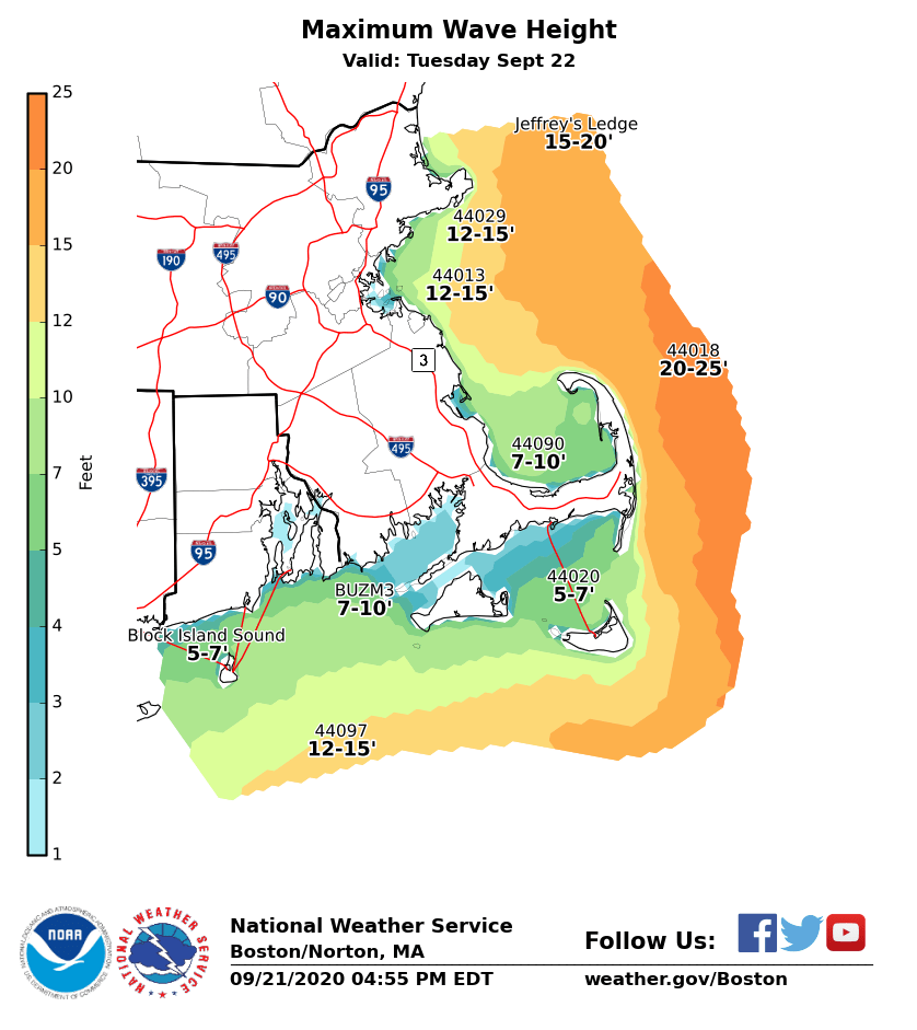 Good afternoon No significant changes to the track of Hurricane Teddy. The storm is still expected to pass about 400 miles east of Massachusetts Tuesday night. The main impact will be for the Marine community. High confidence in high seas of 15 to 25 feet on the outer waters east and southeast of Cape Cod and the Islands. Northerly winds will gust 40 to 50 kt in this area. A Storm Warning is in effect on these waters, while a Gale Warning is up on most other waters. Block Island Sound, Narragansett Bay, and Boston Harbor have Small Craft Advisories. Pockets of minor coastal flooding & beach erosion appear likely during the Tuesday afternoon high tide cycle along the eastern MA coast and particularly across the north facing sides of Cape Cod and Nantucket. While some typically vulnerable shoreline roads may become flooded within a few hours of the high tide, significant coastal flooding is not expected. High surf & dangerous rip currents are expected on ocean exposed beaches. In addition, given the large surf, viewing the large waves or fishing from jetties and/or piers can be very dangerous and is strongly discouraged. A Coastal Flood Advisory is in effect during Tuesday afternoon for the Massachusetts eastern coasts including Nantucket and Marthas Vineyard. Northerly wind gusts of 40 to 50 mph are likely across Cape Cod and Nantucket Tuesday, thus a Wind Advisory remains in effect. No rain is expected from Hurricane Teddy in southern New England. We have attached the expected track of Hurricane Teddy along with our current wave height and wind gust forecasts. If you have any questions or would like more information, don't hesitate to contact us via this email address, on NWSChat <https://nwschat.weather.gov/>, or at the following: National Weather Service Boston/Norton, MA 46 Commerce Way Norton, MA 02766 508.622.3280 Website <http://www.weather.gov/boston> | Facebook <http://www.facebook.com/NWSBoston> | Twitter <http://www.twitter.com/NWSBoston>
