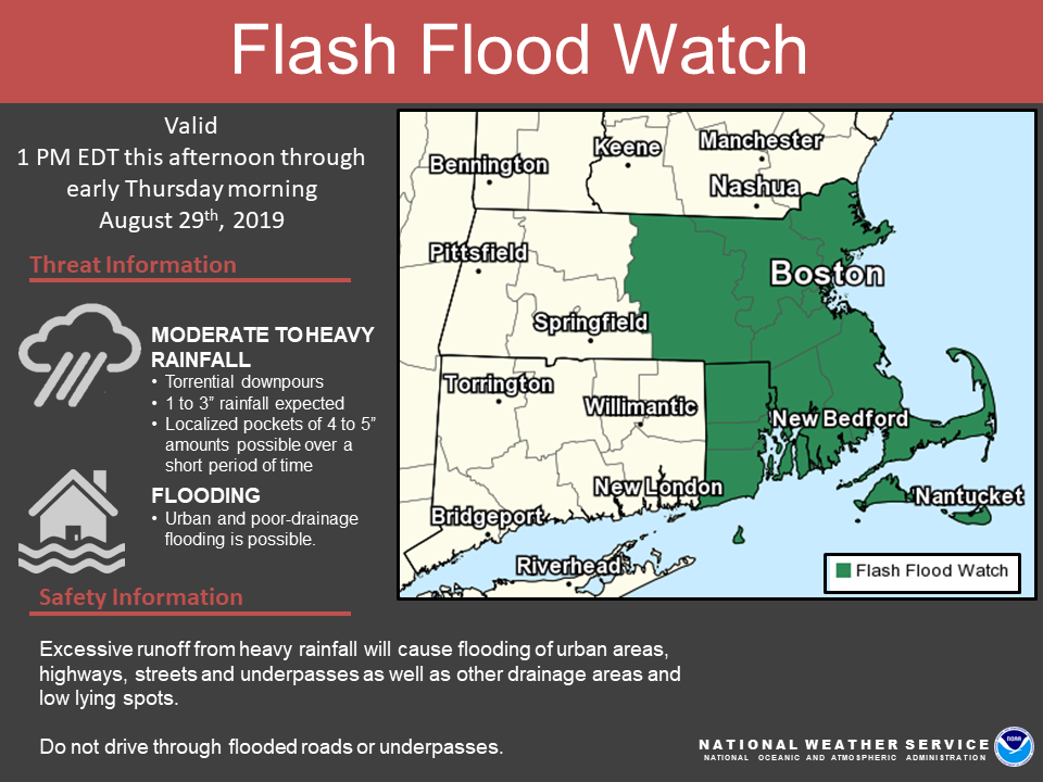 Good morning, Here are our latest thoughts on the potential for heavy rainfall later today which may lead to a risk of localized flash flooding. A* FLASH FLOOD WATCH* has been issued for central/eastern Massachusetts and Rhode Island. Details below. *What:* - Heavy rainfall with rainfall rates 1-2 inches/per hour - 1 to 3" of rainfall expected, with localized pockets of 4 to 5" over a short period of time - Urban and poor drainage flooding possible - *Concern for heavy rain/flooding during evening rush hour* - Low risk for an isolated severe storm *Where:* - All of southern New England, but a greater risk across eastern MA and RI *When:* - Wednesday afternoon through Wednesday night - The greatest risk will be Wednesday evening into the overnight hours *Uncertainty:* - The heaviest rainfall amounts and potential flooding will be localized and may occur anywhere across southern New England. However, the greatest confidence lies within the Flash Flood Watch area. Amounts will vary considerably over short distances. If you have any questions or would like more information, don't hesitate to contact us via this email address, on NWSChat <https://nwschat.weather.gov/>, or at the following: National Weather Service Boston/Norton, MA 46 Commerce Way Norton, MA 02766 508.622.3280 Website <http://www.weather.gov/boston> | Facebook <http://www.facebook.com/NWSBoston> | Twitter <http://www.twitter.com/NWSBoston>