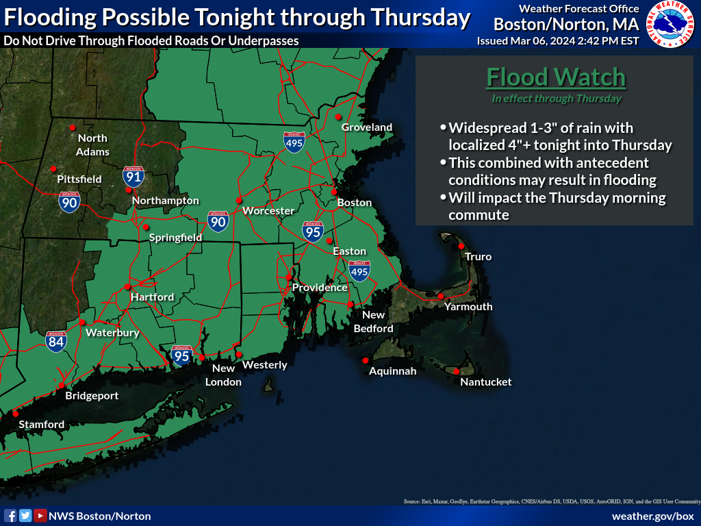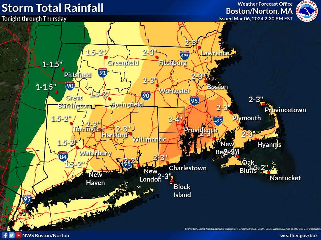 Good afternoon everyone, Attached is our latest and final update on the heavy rain tonight into Thursday. *There have not been any significant changes in our latest update from the last briefing.* We still anticipate a widespread 1-3" of rain with isolated spots of 4"+ possible. This may result in flooding of urban areas, basement flooding, along with rivers and streams. The Thursday morning commute will likely be impacted, especially the first part of it. We've also attached the latest Northeast River Forecast Center (NERFC) forecasts for the Pawtuxet River at Cranston, RI and the Wood River at Hope Valley, RI. For additional locations please visit: https://water.weather.gov/ahps2/forecasts.php?wfo=box Again, this is anticipated to be the final briefing for this event, unless there are significant changes to the forecast. Thanks, Bill Leatham, Torry Dooley and Hayden Frank If you have any questions or would like more information, please don't hesitate to contact us. You can reach us via: email: box.operations@noaa.gov phone: 508.622.3280 Slack/NWSChat 2.0 <https://nwschatws.slack.com/> (for approved partners) social media: Website <http://www.weather.gov/boston> | Facebook <http://www.facebook.com/NWSBoston> | Twitter <http://www.twitter.com/NWSBoston>