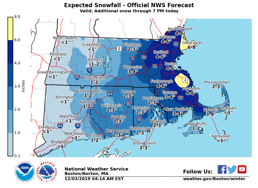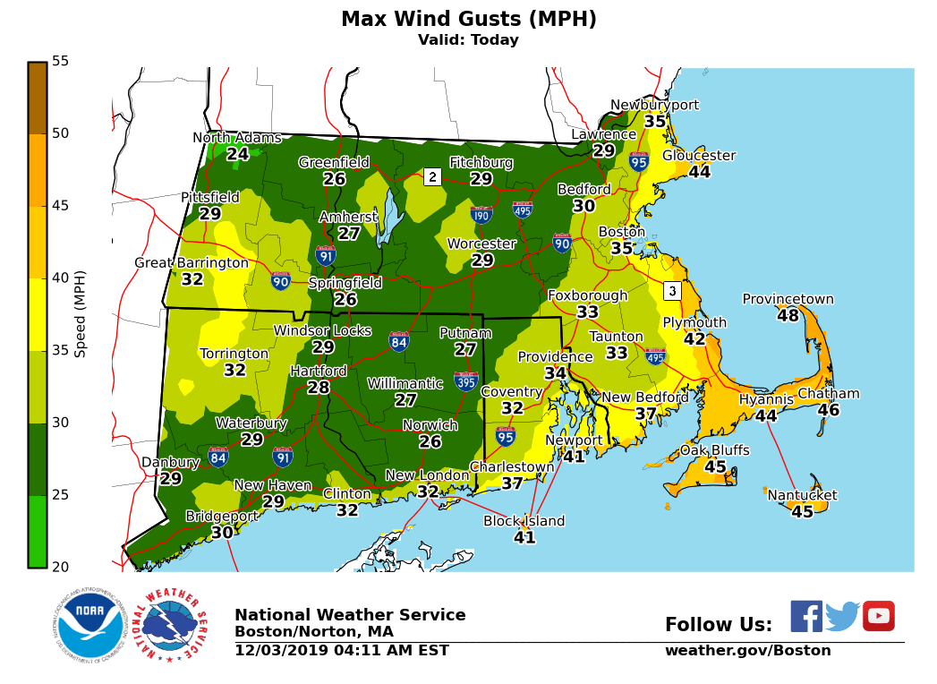 Good morning everyone, Changes this morning: 1. Coastal Flood Advisory in effect this morning for Nantucket. 2. Gale Warning times have been extended. Hazards: 1. Accumulating snow, and potential for poor travel in unplowed/untreated locations. 2. Strong winds coming out of the north and northwest. Wind gusts to 35 mph inland and 45 to 50 mph Cape and Islands. 3. Coastal flooding on Nantucket, with inundation up to one foot above ground level along the shorelines. A band of heavy snow fell from Nashua NH through Worcester and Springfield MA to Hartford and Willimantic CT early this morning. This is now shifting east across Eastern MA and RI. This band produced snowfall rates up to 2 inches per hour during the night. By early afternoon the bulk of the precipitation will be offshore, except for some leftover light rain and light snow in Eastern MA. Please see attached graphics for wind and snow for today. If you have any questions or would like more information, don't hesitate to contact us via this email address, on NWSChat <https://nwschat.weather.gov/>, or at the following: National Weather Service Boston/Norton, MA 46 Commerce Way Norton, MA 02766 508.622.3280 Website <http://www.weather.gov/boston> | Facebook <http://www.facebook.com/NWSBoston> | Twitter <http://www.twitter.com/NWSBoston>