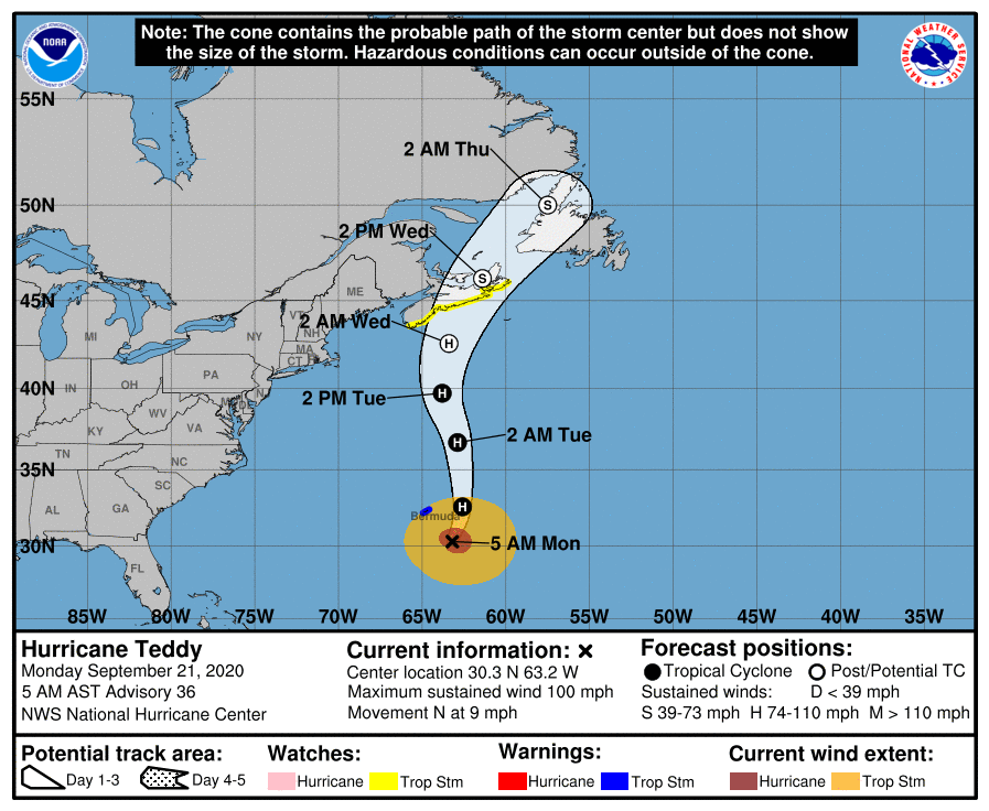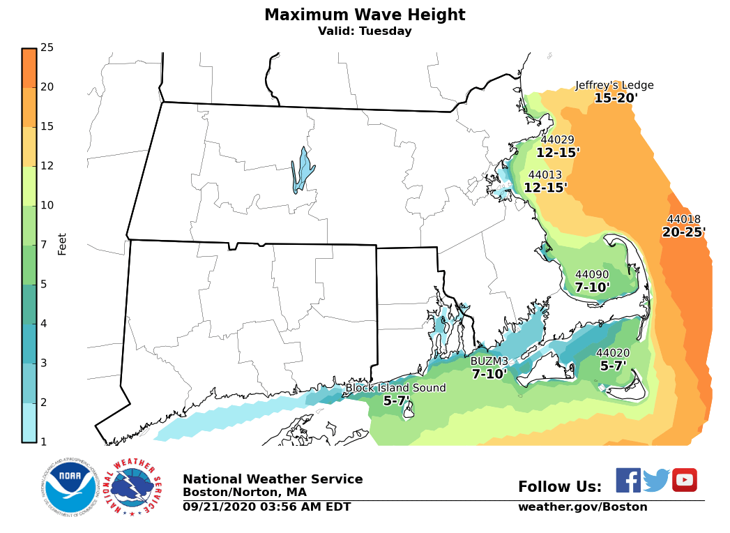 Good morning everyone Still expecting Hurricane Teddy to pass approximately 400 miles east of the Massachusetts coastline Tuesday. The main impact will be for our Marine community. We have high confidence in dangerously high seas of 15 and 25 feet developing across the ocean waters east of Cape Cod and Nantucket, as northerly wind gusts to 40 to 50 knots. Pockets of minor coastal flooding & beach erosion appear likely during the Tuesday afternoon high tide cycle along the eastern MA coast and particularly across the north facing sides of Cape Cod and Nantucket. While some typically vulnerable shoreline roads may become flooded within a few hours of the high tide, significant coastal flooding is not expected. High surf & dangerous rip currents are expected on ocean exposed beaches. In addition, given the large surf, viewing the large waves or fishing from jetties and/or piers can be very dangerous and is strongly discouraged. Northerly wind gusts of 40 to 50 mph are likely across Cape Cod and Nantucket Tuesday, thus a Wind Advisory has been posted. No rain is expected from Hurricane Teddy in southern New England. We have attached the expected track of Hurricane Teddy along with our current wave height and wind gust forecasts. Frank Nocera & Hayden Frank Please let us know if you have any questions. Thank you. If you have any questions or would like more information, don't hesitate to contact us via this email address, on NWSChat <https://nwschat.weather.gov/>, or at the following: National Weather Service Boston/Norton, MA 46 Commerce Way Norton, MA 02766 508.622.3280 Website <http://www.weather.gov/boston> | Facebook <http://www.facebook.com/NWSBoston> | Twitter <http://www.twitter.com/NWSBoston>