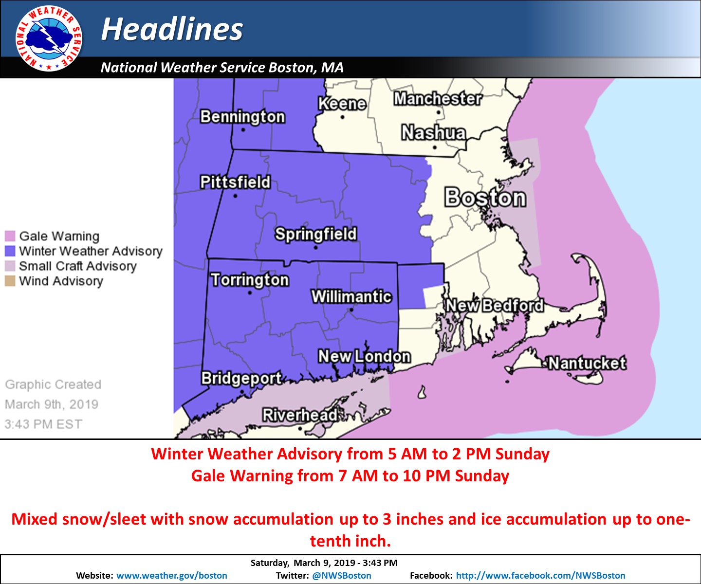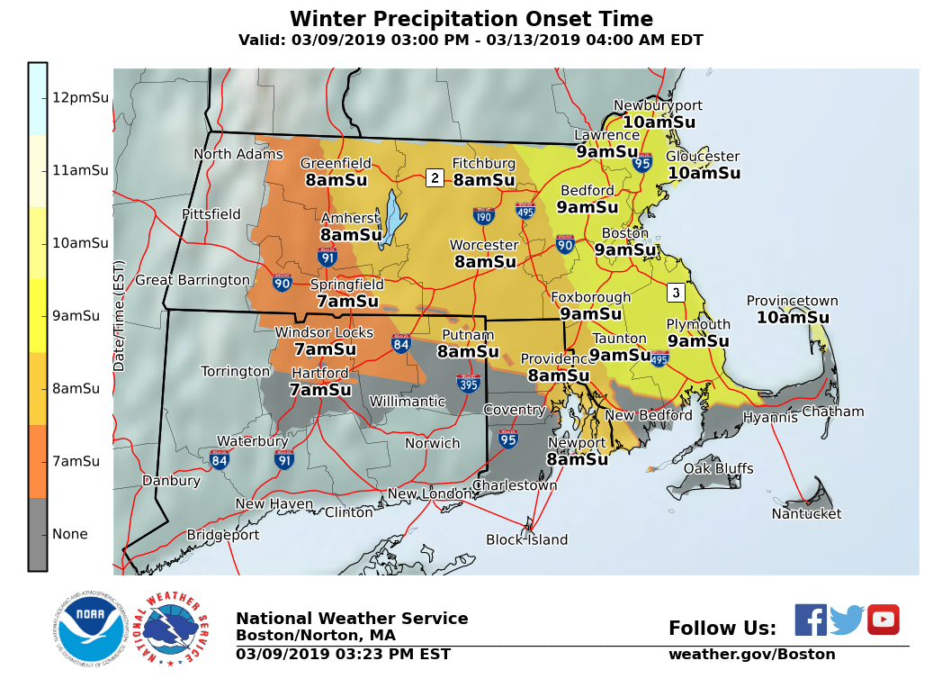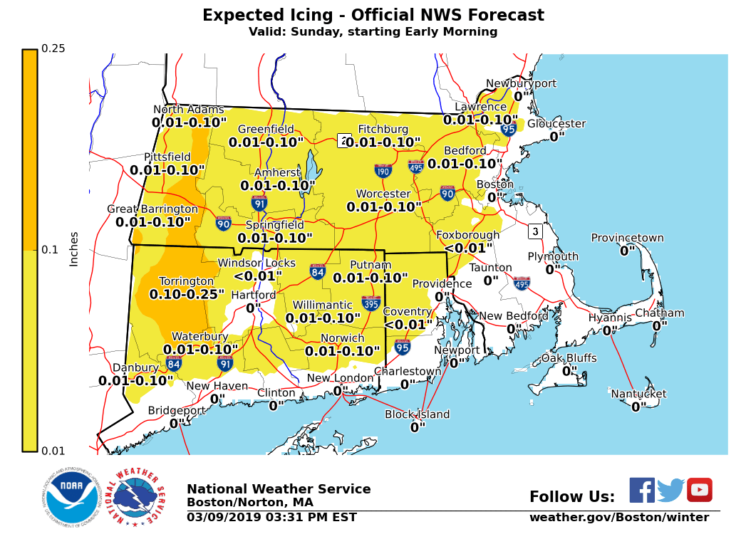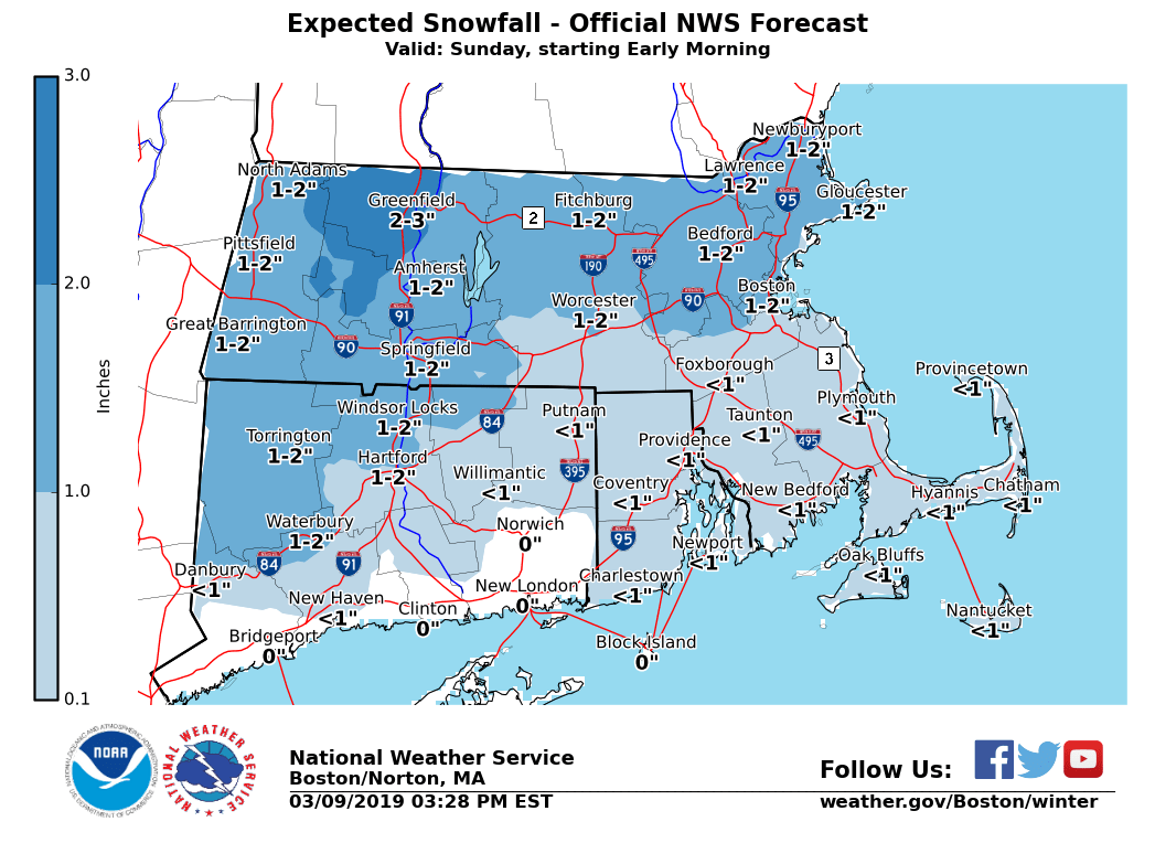 Good afternoon. A Winter Weather Advisory continues for western and central MA, as well as northern CT and into northwest RI early Sunday morning into midday. This is for 1 to 3 inches of snow and sleet followed by a brief period of light icing. The expected onset time of the snow/sleet, along with the latest snowfall and ice accretion forecasts have been attached to this email. *WHAT IS NEW:* - Most of the forecast continues unchanged. - Time of snow onset is an hour later. - Snow amounts were reduced a little, based on later start time compared to sunrise. *WHAT/WHERE: * - 1 to 3 inches of snow and sleet expected near and northwest of the Boston to Providence corridor. Greatest risk for the higher snow amounts will be in western MA. - A period of light freezing rain anticipated across interior MA/CT and into northwest RI. Ice accretion amounts will be light, generally a trace to no more than a tenth of an inch. *WHEN:* - Snow and sleet develop from west to east between 5 and 10 am Sunday morning. A brief burst of heavy snow is possible which may result in roads quickly becoming snow covered, especially in western/central MA into northern CT. - Precipitation will change to rain by Sunday afternoon along and southeast of the Boston to Providence corridor. Northwest of that region, a period of light freezing rain is expected which should gradually change to all rain by mid afternoon. *IMPACTS:* - Roads may quickly become snow covered Sunday morning with a brief burst of moderate to heavy snow possible. This may also result in a period of poor visibility. - Conditions should improve in most locations by early Sunday afternoon, but some icy spots may remain possible across the highest terrain of MA - In areas that have the change to rain, roads with snow/ice-covered drains will have ponding of water with potential for hydroplaning or splashing of sidewalks. *UNCERTAINTY:* *- *Our current forecast calls for 1 to 3 inches of snow near and northwest of the Boston to Providence corridor with the highest amounts likely in western MA. *- *If the change from snow to sleet is delayed, many locations may receive 2 to 4 inches of snow. However, if the change to sleet is earlier then expected most areas will receive an inch or less of accumulations. - Regardless, snow and sleet will result in slippery travel Sunday morning along with with reduced visibility. If you have any questions or would like more information, please don't hesitate to contact us via this email address, on NWSChat <https://nwschat.weather.gov/>, or at the following: National Weather Service Boston/Norton, MA 46 Commerce Way Norton, MA 02766 508.622.3280 Website <http://www.weather.gov/boston> | Facebook <http://www.facebook.com/NWSBoston> | Twitter <http://www.twitter.com/NWSBoston>