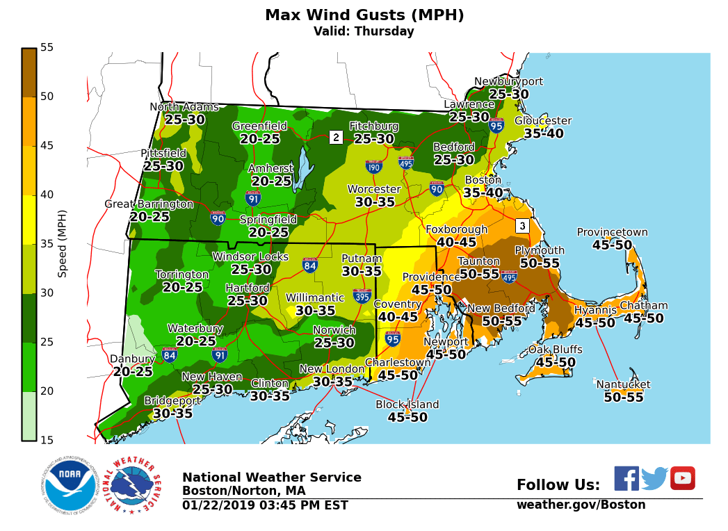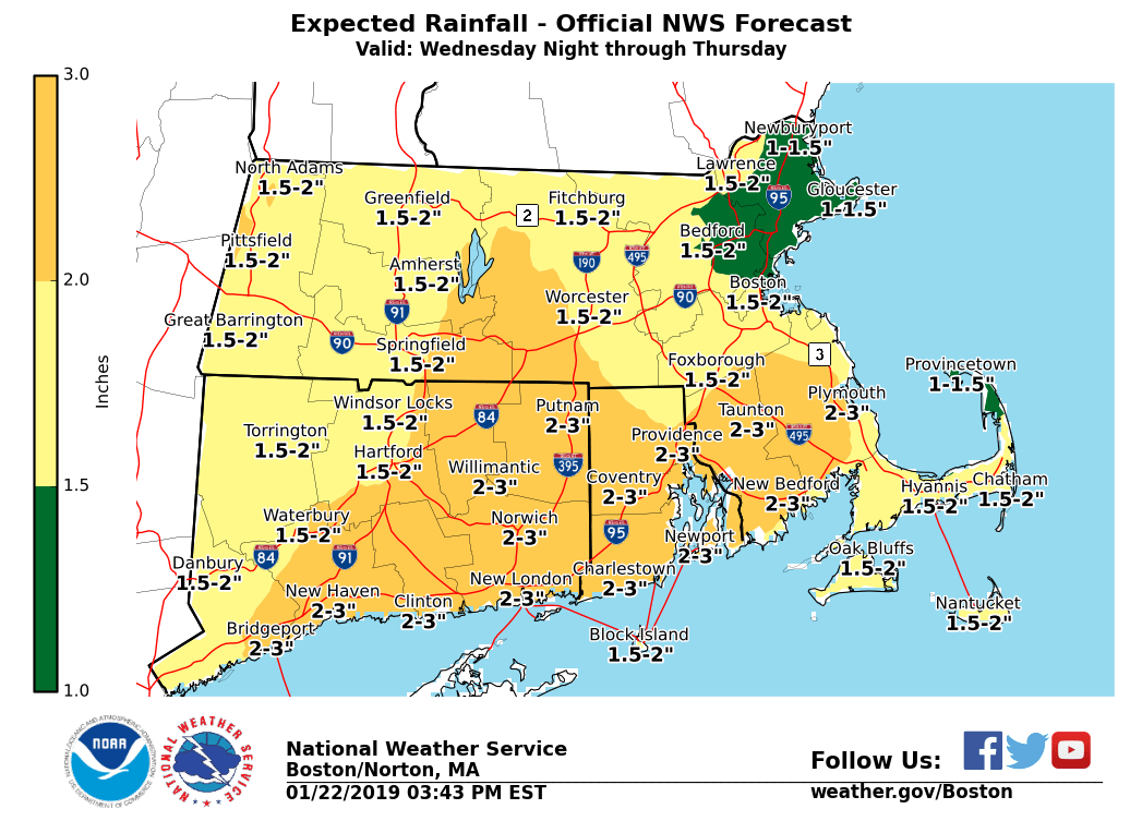 Good afternoon everyone, We continue to monitor the risk for heavy rain and possible flooding as well as strong winds for late Wednesday night into Thursday. In addition, there is a risk for a bit of sleet or freezing rain Wednesday afternoon over the higher elevations. *What / Where / When ...* - Risk for Light Icing with Sleet or Freezing rain - Main risk over the Berkshires and northern Worcester Hills Wednesday afternoon. - Temperatures should be above freezing but very cold ground temperatures may lead to some light icing and slippery travel on untreated surfaces - Winter Weather Advisory in effect for Berkshire County - Heavy Rainfall and Possible Flooding - Greatest risk across eastern Connecticut, Rhode Island and southeast Massachusetts for late Wednesday night into Thursday - Rainfall of 1-2 inches across southern New England with locally up to 3 inches for eastern CT, RI and SE Massachusetts - Areas of urban and poor drainage flooding possible, as well as some river flooding - Rivers at risk for minor flooding include: - Farmington River at Simsbury, CT - Pawcatuck River at Westerly and Wood River Junction, RI - Wood River at Hope Valley, RI - Taunton River at Bridgewater, MA - Strong Winds - Greatest risk across Rhode Island and SE Massachusetts, including the Cape and Islands, late morning into the afternoon on Thursday - Wind gusts 50-55 mph possible with tree damage and isolated power outages possible If you have any questions or would like more information, don't hesitate to contact us via this email address, on NWSChat <https://nwschat.weather.gov/>, or at the following: National Weather Service Boston/Norton, MA 46 Commerce Way Norton, MA 02766 508.622.3280 Website <http://www.weather.gov/boston> | Facebook <http://www.facebook.com/NWSBoston> | Twitter <http://www.twitter.com/NWSBoston>