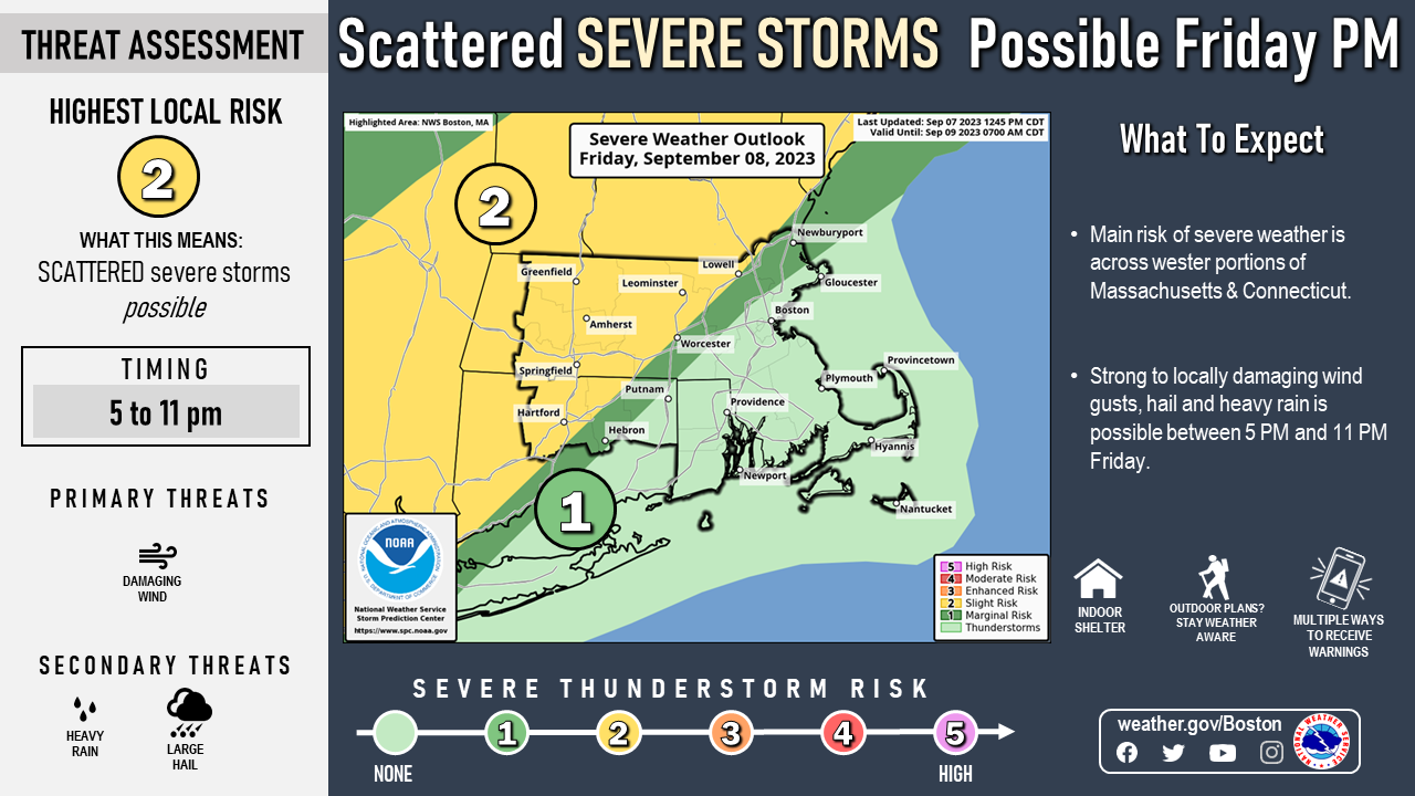 Good afternoon everyone, The only change with this forecast update is the risk for severe weather Friday is farther east into western portions of Massachusetts & Connecticut Friday afternoon & evening. The main threat would be isolated damaging wind gusts & locally heavy rain. Otherwise, Heat Advisories continue for most of the region away from the immediate coast Friday. Not quite as hot Friday, but nonetheless, high temperatures of 85-90 are expected along with heat indices from 95 to 100. Attached is a graphic indicating the main risk of severe weather and a map of the Heat Advisories along with the expected Heat Indices Friday. Please let us know if you have any questions or concerns. Thank You! Frank Nocera & Andrew Loconto If you have any questions or would like more information, please don't hesitate to contact us. You can reach us via: email: box.operations@noaa.gov phone: 508.622.3280 Slack/NWSChat 2.0 <https://nwschatws.slack.com/> (for approved partners) social media: Website <http://www.weather.gov/boston> | Facebook <http://www.facebook.com/NWSBoston> | Twitter <http://www.twitter.com/NWSBoston>