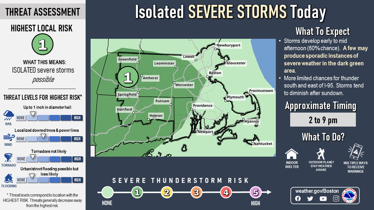 Good morning, Scattered thunderstorms are expected to develop this afternoon across Southern New England, with a somewhat greater chance north and west of Interstate I-95. A few of these storms may produce sporadic, isolated instances of severe weather, indicated in the dark green area on the attached severe weather graphic. The main risk remains isolated downed trees and power lines produced by thunderstorm wind gusts between 40 to 60 mph. Up to 1 inch diameter hailstones are possible, but it is a secondary risk and the majority should remain below 1 inch in diameter. Localized downpours are possible with any thunderstorm, which may produce urban/street flooding if persistent thunderstorms develop over urban or poor drainage areas; however overall risk for flooding is low. Still thinking the timing is between 2 to 9 pm today, particularly during the mid to late afternoon hours. This will be our last update for this event, unless there is a significant change. Meteorologists: Bryce Williams and Matthew Belk If you have any questions or would like more information, don't hesitate to contact us via this email address, on NWSChat <https://nwschat.weather.gov/>, or at the following: National Weather Service Boston/Norton, MA 46 Commerce Way Norton, MA 02766 508.622.3280 Website <http://www.weather.gov/boston> | Facebook <http://www.facebook.com/NWSBoston> | Twitter <http://www.twitter.com/NWSBoston>