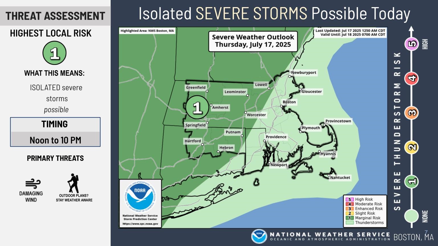 Good morning everyone... A Heat Advisory continues through 7 pm this evening for all of southern New England except the Berkshires as well as the Cape and Islands. Heat indices will reach between 95-100+ degrees. There is also the risk for isolated severe weather later today into the first half of this evening, but widespread severe weather is not expected. The main concern would be localized damaging wind gusts. Attached is a brief one pager along with the graphics of the Heat Advisory and Isolated Severe Weather Risk. This is the last planned briefing for this event. Please let us know if you have any questions or concerns! Thank You! Meteorologist: Hayden Frank If you have any questions or would like more information, please don't hesitate to contact us. You can reach us via: email: box.operations@noaa.gov phone: 508.622.3280 Slack/NWSChat 2.0 <https://nwschatws.slack.com/> (for approved partners) social media: Website <http://www.weather.gov/boston> | Facebook <http://www.facebook.com/NWSBoston> | Twitter <http://www.twitter.com/NWSBoston>