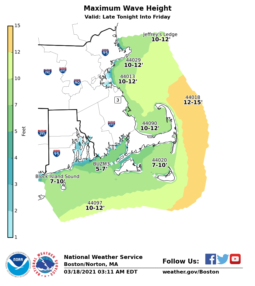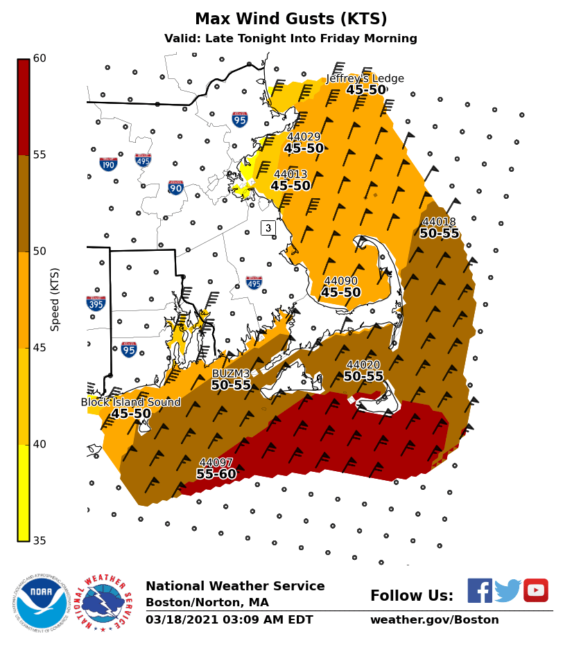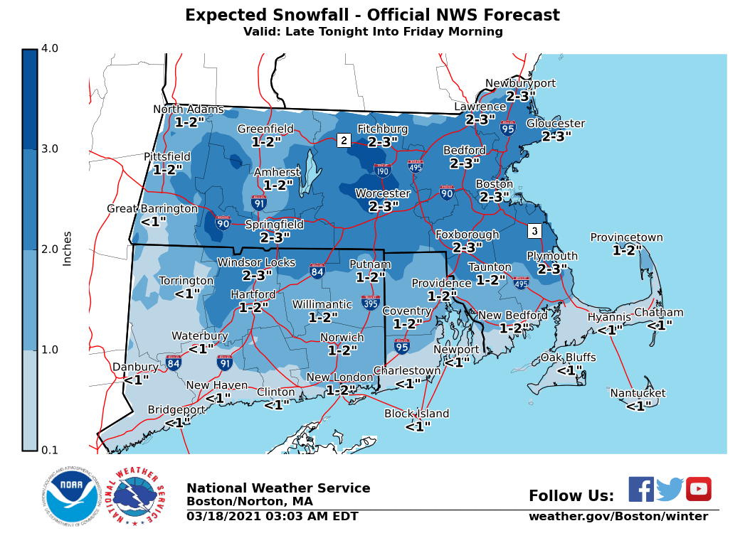 Good Morning, Please see the attached one-page briefing and images which provide information on rain changing to snow and strong winds later tonight into Friday morning. We have not made significant changes since the last briefing, but did increase wind gusts near Nantucket and the adjacent coastal waters, where northeast winds should gust to 60 MPH at times. As a result, a High Wind Warning has been issued for Nantucket and Storm Warnings have been issued for the adjacent coastal waters. Regarding snowfall, we still anticipate totals of 1-3 inches overnight. There is a low risk of one or two places in Massachusetts receiving 4-5 inches, primarily in the Worcester Hills. The snow will be wet in consistency (snow to liquid ratio of around 7:1). Thanks, Kevin Cadima and Joe DelliCarpini If you have any questions or would like more information, don't hesitate to contact us via this email address, on NWSChat <https://nwschat.weather.gov/>, or at the following: National Weather Service Boston/Norton, MA 46 Commerce Way Norton, MA 02766 508.622.3280 Website <http://www.weather.gov/boston> | Facebook <http://www.facebook.com/NWSBoston> | Twitter <http://www.twitter.com/NWSBoston>