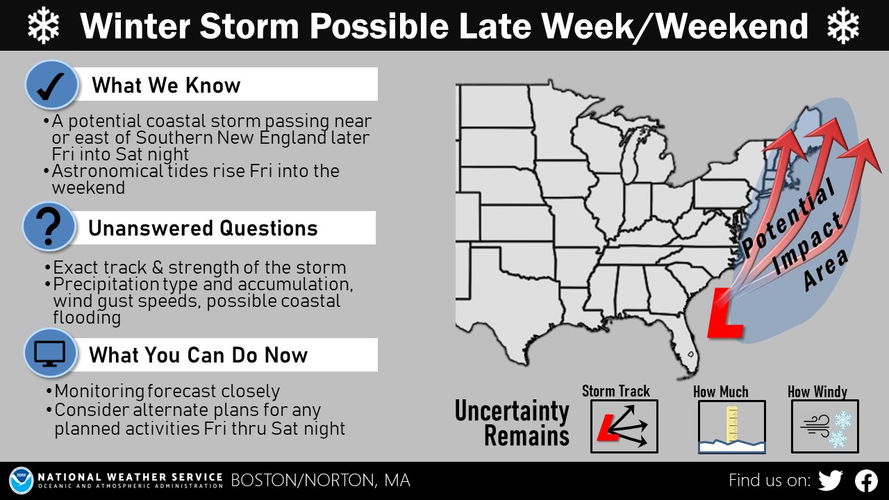 Good afternoon, We wanted to let everyone know that we're tracking a potential winter storm that may impact the northeast US late this week/early this weekend. Details in timing and impacts are highly uncertain, but with the right storm track the potential exists for heavy snow, strong winds, and coastal flooding for portions of southern New England. We expect to have higher confidence in any potential impacts for southern New England over the next 36-48 hours when the track of the system will start to become more clear. Thank you, Rob Megnia, Kristie Smith, Bill Babcock, and Bill Leatham If you have any questions or would like more information, don't hesitate to contact us via this email address, on NWSChat <https://nwschat.weather.gov/>, or at the following: National Weather Service Boston/Norton, MA 46 Commerce Way Norton, MA 02766 508.622.3280 Website <http://www.weather.gov/boston> | Facebook <http://www.facebook.com/NWSBoston> | Twitter