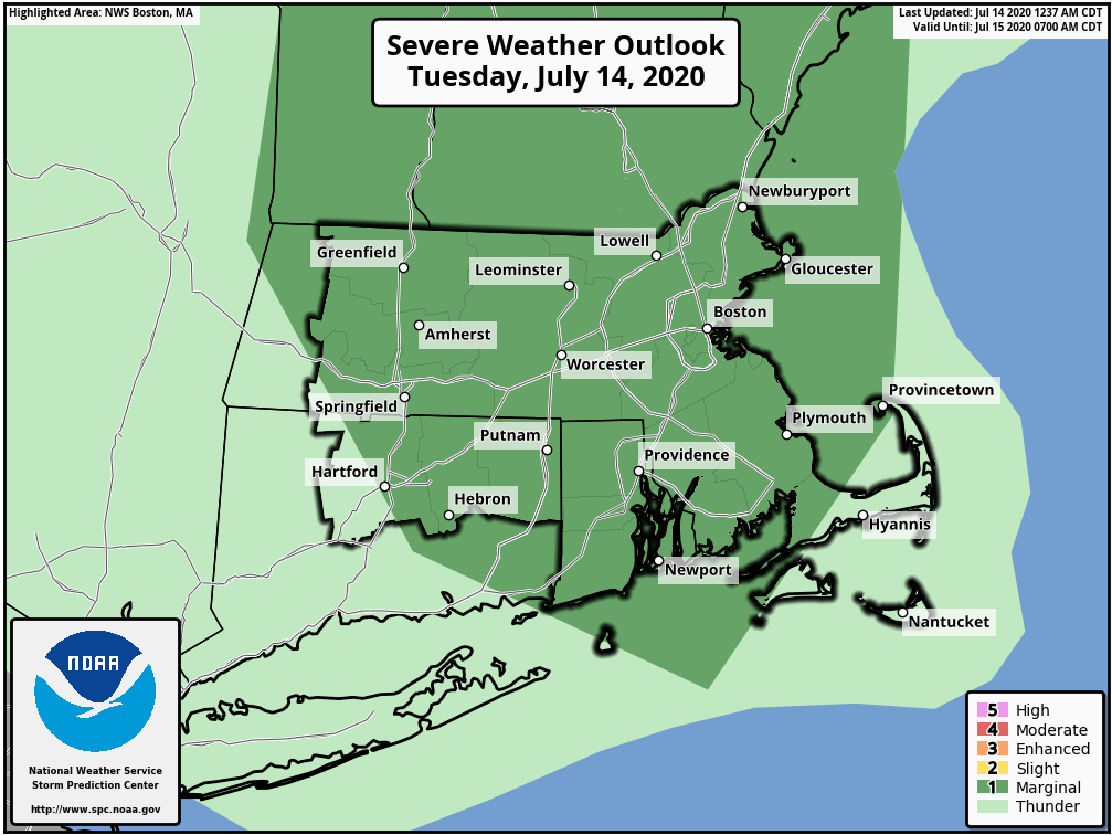 Good morning everyone, We wanted to let you know there is a chance for some isolated strong to severe thunderstorms today, especially this afternoon and evening. This doesn't look like a widespread severe event but some severe storms are possible. *Threats:* Damaging winds, small hail, and localized flash flooding *Timing: * Mid morning through the evening; best chance after noon *Location: * The highest risk is in central/northern MA into northern RI and eastern CT. Thanks, Bryce Williams and Bill Leatham If you have any questions or would like more information, don't hesitate to contact us via this email address, on NWSChat <https://nwschat.weather.gov/>, or at the following: National Weather Service Boston/Norton, MA 46 Commerce Way Norton, MA 02766 508.622.3280 Website <http://www.weather.gov/boston> | Facebook <http://www.facebook.com/NWSBoston> | Twitter <http://www.twitter.com/NWSBoston>