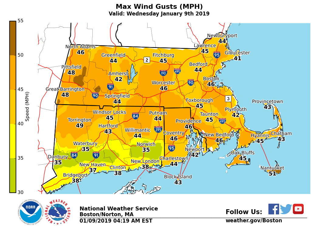 Good morning everyone, A wind advisory has been posted for all of Massachusetts, Rhode Island and northern Connecticut. Here are additional details ... *What / Where / When ...* - Strong to perhaps damaging west to northwest winds later this morning and into the afternoon. Winds likely strong enough to bring down branches and small tree limbs with possibly isolated power outages - All of Massachusetts, Rhode Island and northern Connecticut. This includes the cities of Boston, Providence and Hartford. - Timing of strongest winds from about 10 AM to 3 PM. Winds will not be as strong after sunset. Attached is a graphic with forecast wind gusts this morning and afternoon. Meteorologist - Frank Nocera If you have any questions or would like more information, don't hesitate to contact us via this email address, on NWSChat <https://nwschat.weather.gov/>, or at the following: National Weather Service Boston/Norton, MA 46 Commerce Way Norton, MA 02766 508.622.3280 Website <http://www.weather.gov/boston> | Facebook <http://www.facebook.com/NWSBoston> | Twitter <http://www.twitter.com/NWSBoston>