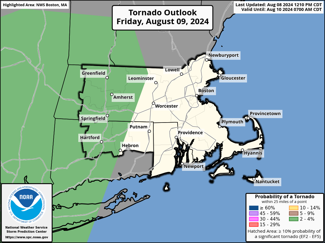 Good Afternoon Everyone, The remnants of Debby are forecast to pass to the west of New England Friday afternoon and evening. As it does so, there is a *low risk* of a short-lived tornado, mainly in the western third of Massachusetts (west of Worcester) and in the western two-thirds of Connecticut. The attached graphic shows the area most at risk. The most likely time frame is during the afternoon and evening Friday, roughly between 3 PM and 11 PM. We will send another brief email early Friday morning. If you have any questions or would like more information, please don't hesitate to contact us. You can reach us via: email: box.operations@noaa.gov phone: 508.622.3280 Slack/NWSChat 2.0 <https://nwschatws.slack.com/> (for approved partners) social media: Website <http://www.weather.gov/boston> | Facebook <http://www.facebook.com/NWSBoston> | Twitter <http://www.twitter.com/NWSBoston> Thanks, Joe Dellicarpini and Bryce Williams