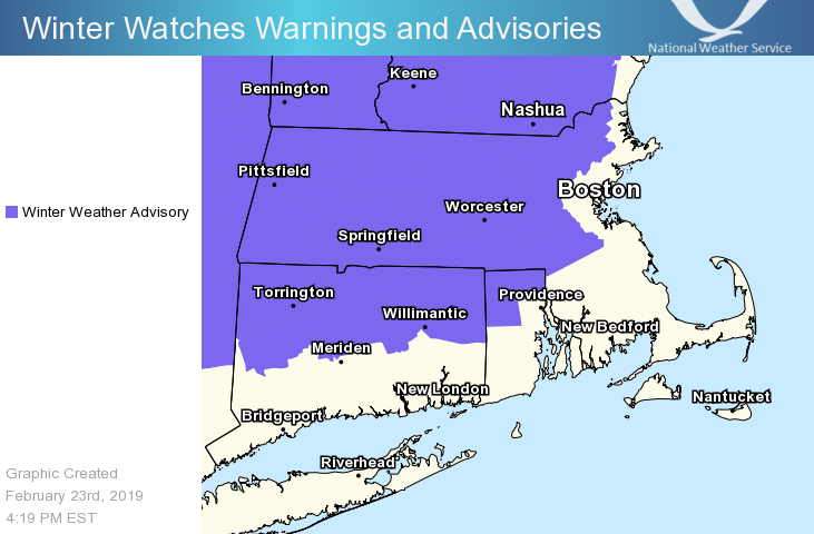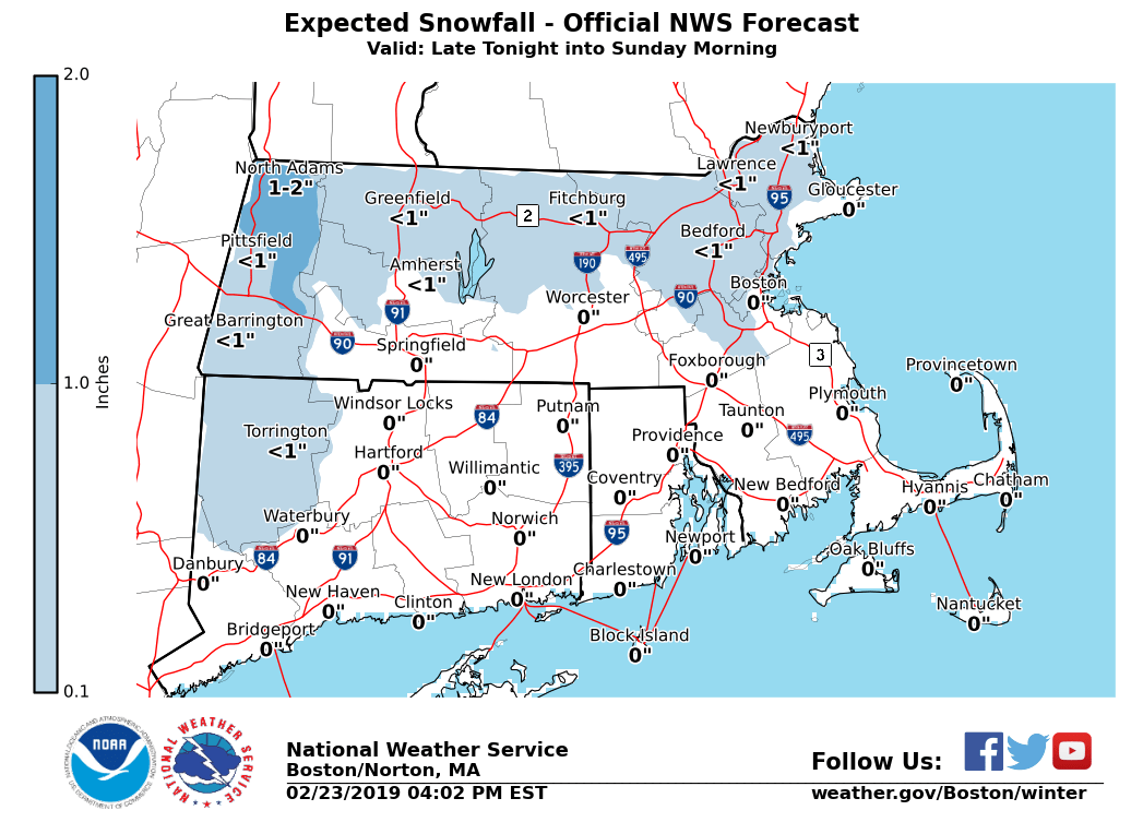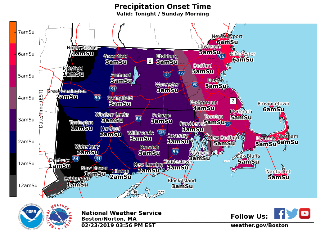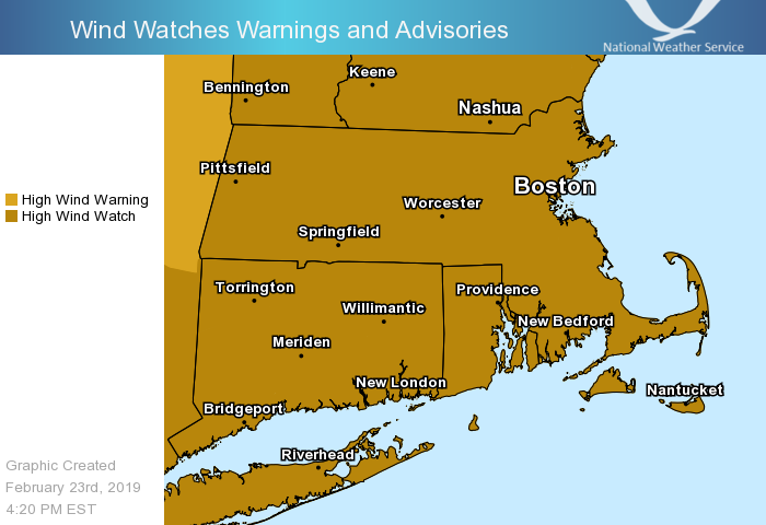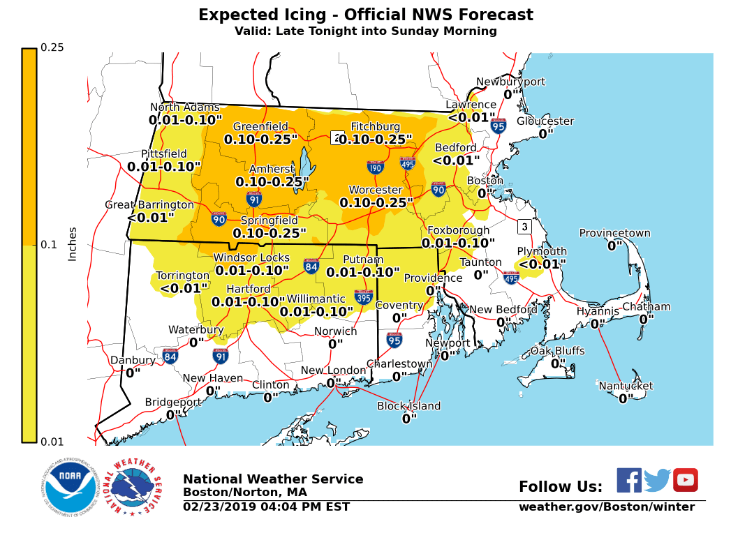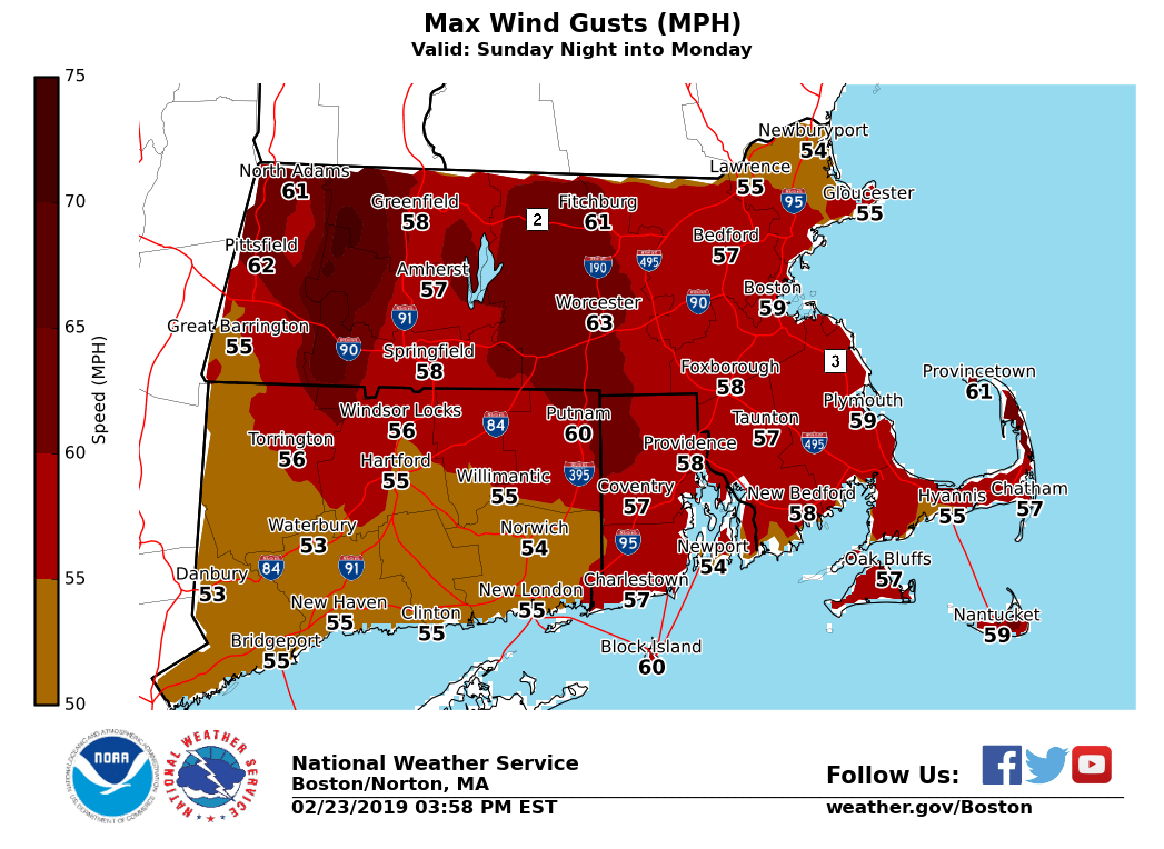 Good afternoon everyone, Wintry weather is expected Saturday night into Sunday, followed by damaging winds Sunday night through Monday night. Details below. *Headlines Changes ... * - *WINTER WEATHER ADVISORY* - Expanded into all of northern CT and northwest RI late tonight & early Sunday - *HIGH WIND WATCH* - Expanded across all of MA, RI & CT for Sunday night into Monday - *STORM WARNING* - All other waters beginning Sunday night into Monday *Winter Weather ...* - *What:* Brief light snow / sleet quickly changes to freezing rain across the interior before changing over to rain; sleet to rain along the coast. Ice accretion of a trace up to two tenths; highest over the Berkshires, Worcester Hills, and Pioneer Valley. - *When:* Beginning after midnight for Hartford / Springfield; 3 am to 5 am Providence/Boston. Changing to rain by mid morning Sunday. - *Impacts:* Low impact given marginal temperatures. Snow / ice covered roadways linger into Sunday morning. *Winds ...* - *What:* Strong to damaging winds are forecast. Wind gusts 55 to 65 mph; potential for gusts as strong as 70 mph. - *When:* Beginning Sunday night, peaking Monday afternoon, gradually diminishing through Tuesday. - *Impacts:* Downed tree limbs / trees as well as power lines. Scattered power outages and blocked roads likely due to tree / power line debris. Meteorologists: Frank Nocera & Matthew Doody If you have any questions or would like more information, don't hesitate to contact us via this email address, on NWSChat <https://nwschat.weather.gov/>, or at the following: National Weather Service Boston/Norton, MA 46 Commerce Way Norton, MA 02766 508.622.3280 Website <http://www.weather.gov/boston> | Facebook <http://www.facebook.com/NWSBoston> | Twitter <http://www.twitter.com/NWSBoston>