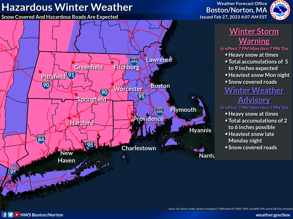 - Winter Storm Warnings issued for the entire state of Connecticut, western-central MA into most of RI, for 5 to 9 inches of snow, with highest amounts across the high terrain of western MA/CT. - Elsewhere, Winter Weather Advisories are in effect from 7 pm Mon to 7 pm Tue, for 2 to 5 inches.
