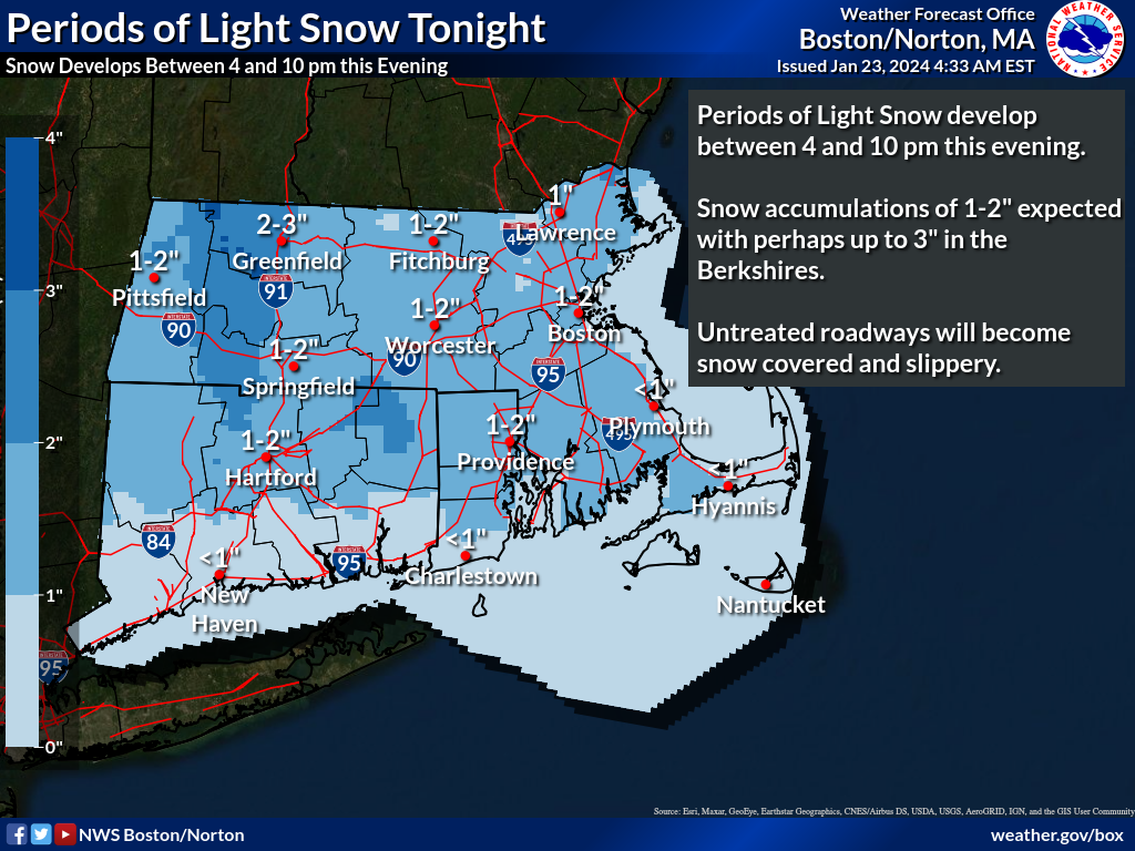 [2024.01.23 AM] NWS Boston EM Briefing: Light Snow tonight followed by light icing on Wednesday across the interior high terrain