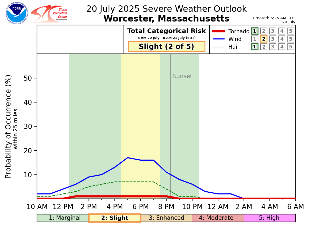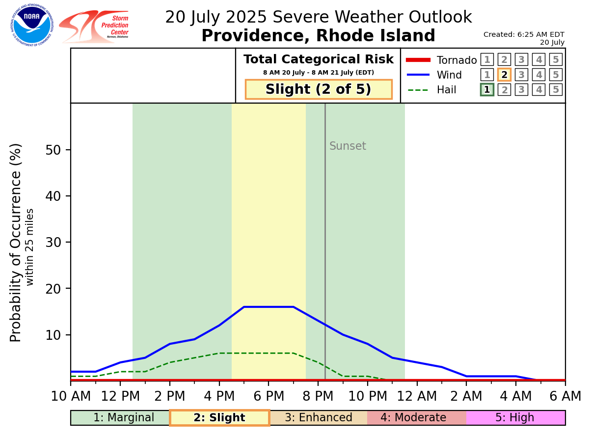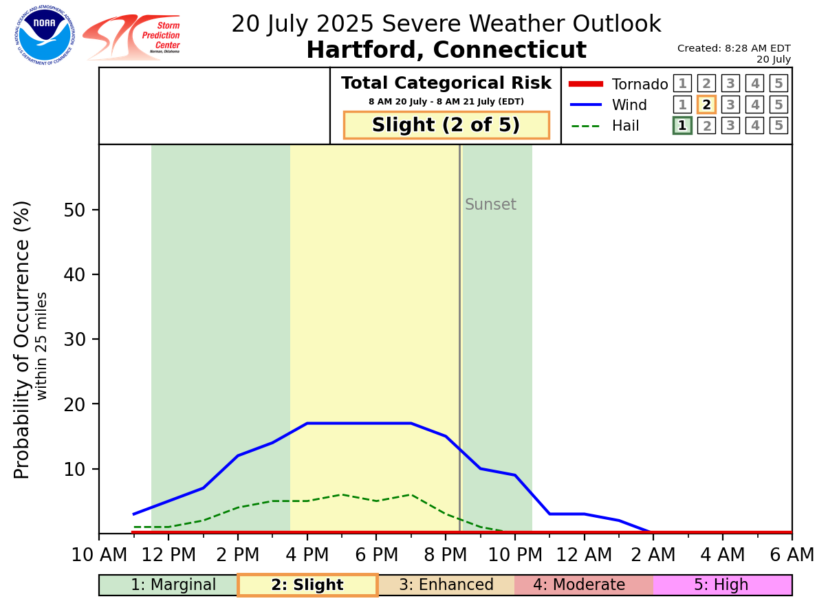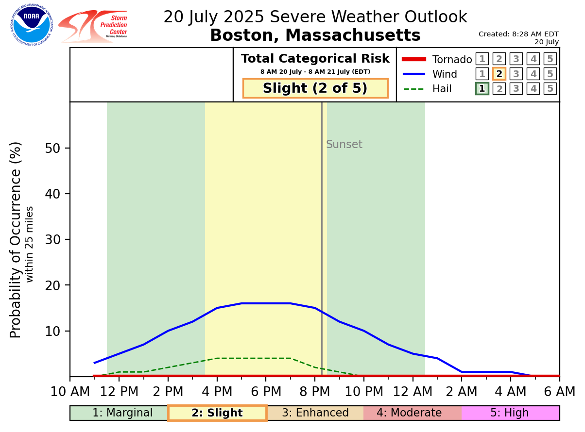 Good morning everyone, We wanted to provide a quick update on the potential for severe thunderstorms later today and early tonight. Not much has changed since the previous briefing. The time frame for severe thunderstorms is between 4 PM and 10 PM with localized wind damage being the main threat as thunderstorms track from northwest to southeast across the region. Please see the attached one-page briefing and timing graphics for more information. This will be the final briefing on this event. If you have any questions or would like more information, please don't hesitate to contact us. You can reach us via: email: box.operations@noaa.gov phone: 508.622.3280 Slack/NWSChat 2.0 <https://nwschatws.slack.com/> (for approved partners) social media: Website <http://www.weather.gov/boston> | Facebook <http://www.facebook.com/NWSBoston> | Twitter <http://www.twitter.com/NWSBoston> Thanks, Joe Dellicarpini and Kyle Pederson